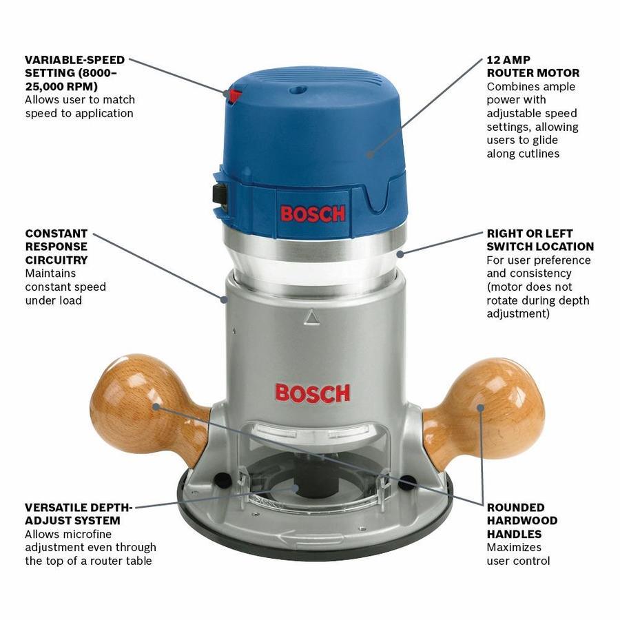 12 Amp router motor - combines ample power with adjustable speed settings, allowing users to glide along cutlines