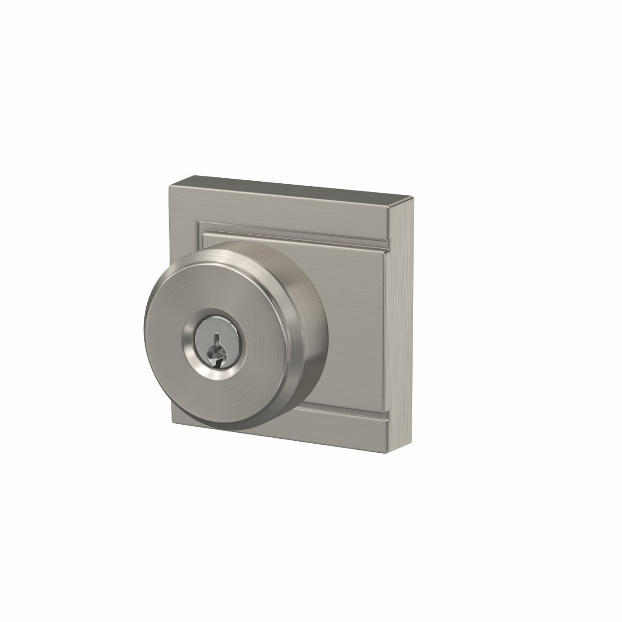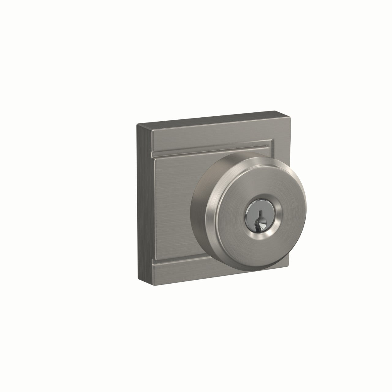Secure your entry with the Schlage Bowery knob in Satin Nickel, paired with the Upland trim for a crisp, modern look. Designed for keyed entry doors, it offers premium metal construction and top-tier BHMA AAA ratings for security, durability, and finish.