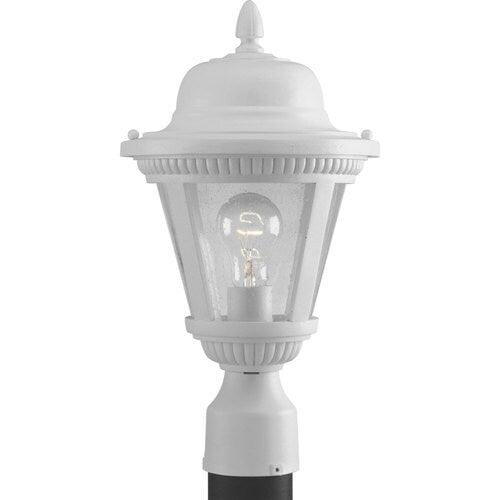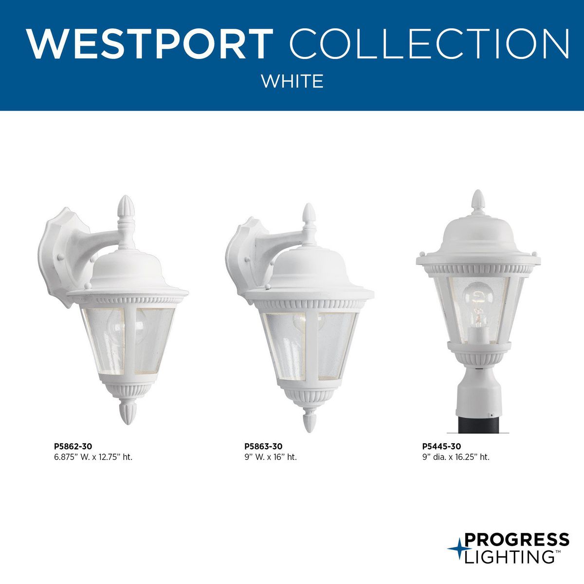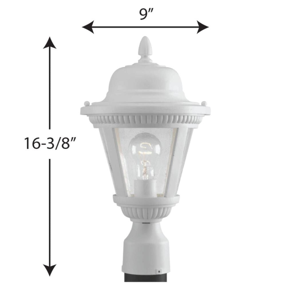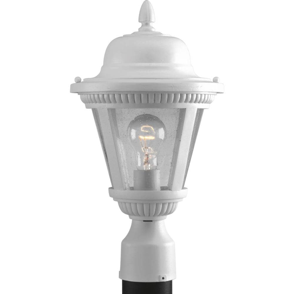 Bring classic curb appeal to your outdoor spaces with the Westport post lantern from Progress Lighting. Crafted from durable die-cast aluminum in a crisp white powder-coat finish, it features clear seeded glass and fits a standard 3-in post. Designed for wet locations, it uses one medium-base bulb up to 100W and is dimmable with compatible bulbs.