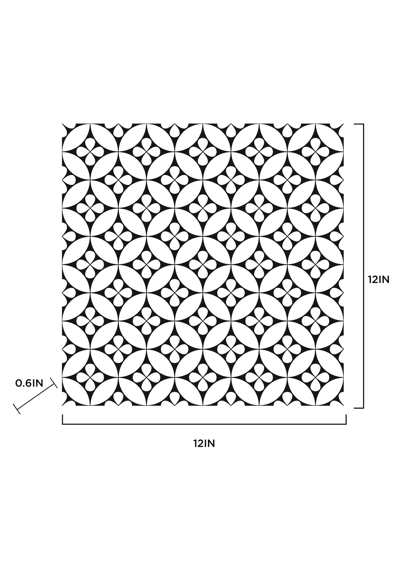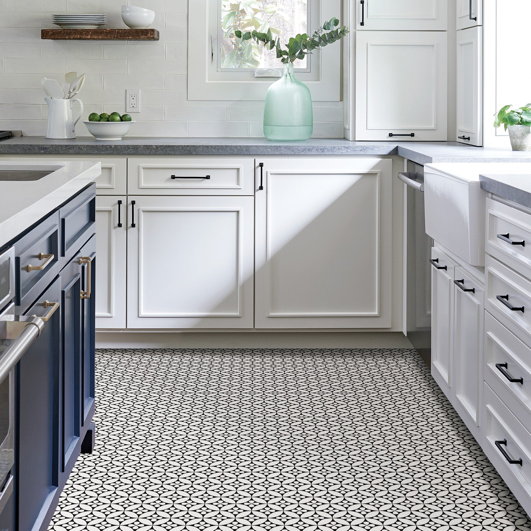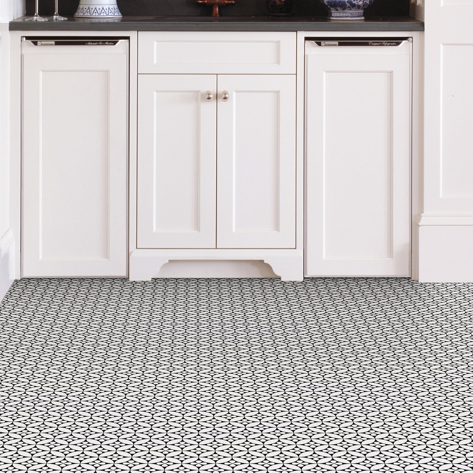 Give floors a fast, stylish refresh with these water-resistant peel-and-stick vinyl tiles in a modern black and white geometric pattern. Each 12-in x 12-in tile features a durable virgin vinyl construction with a low-luster textured finish and permanent adhesive for easy, grout-free installation.