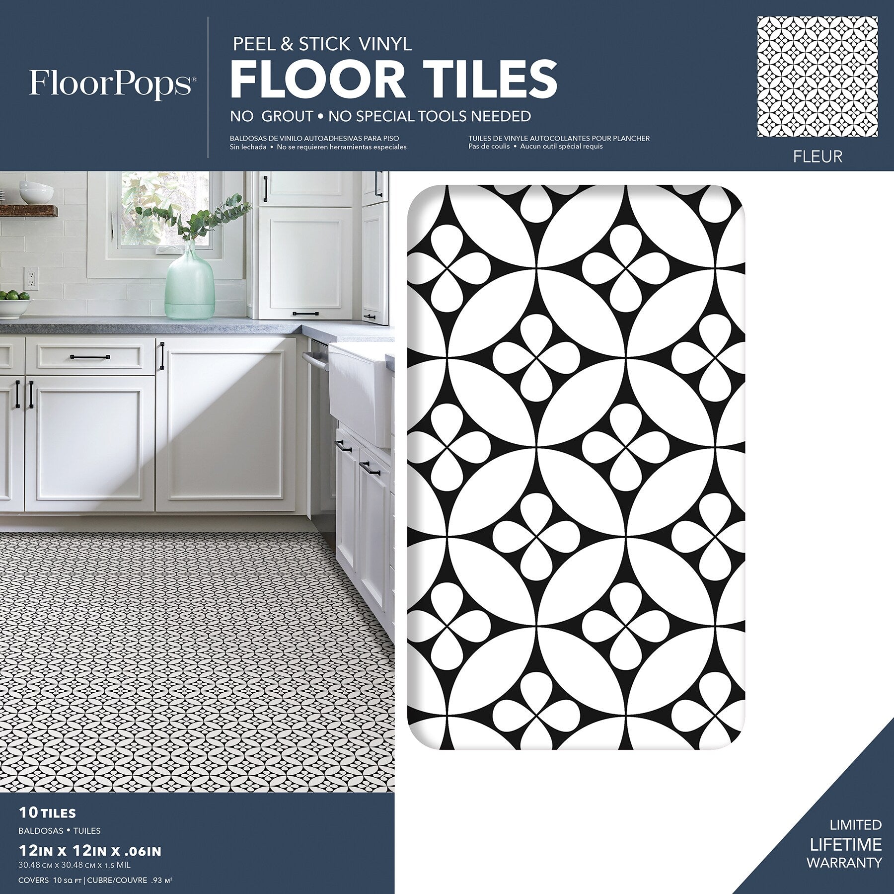 FloorPops Fleur Black & White 12-in x 12-in Peel and Stick Vinyl Floor Tiles, Water-Resistant, 20-sq ft Coverage