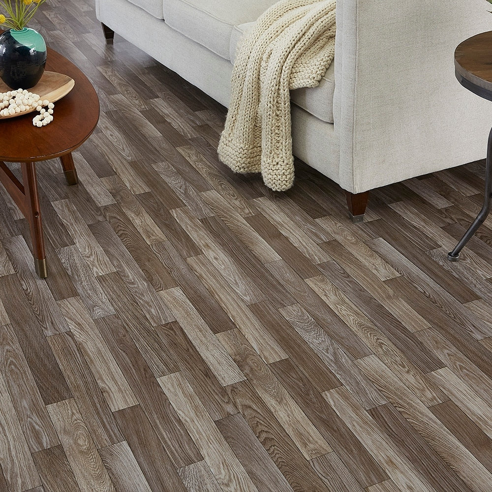 Durable, waterproof sheet vinyl in a warm Highland Oak wood look. Cut-to-length 12-ft wide rolls feature a low-gloss finish, fiberglass construction, and an easy DIY glue-down installation—ideal for kitchens, baths, laundry rooms, and basements.
