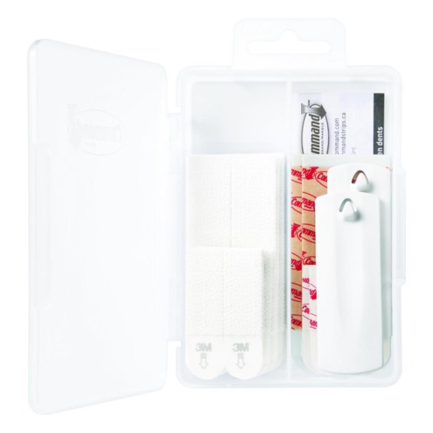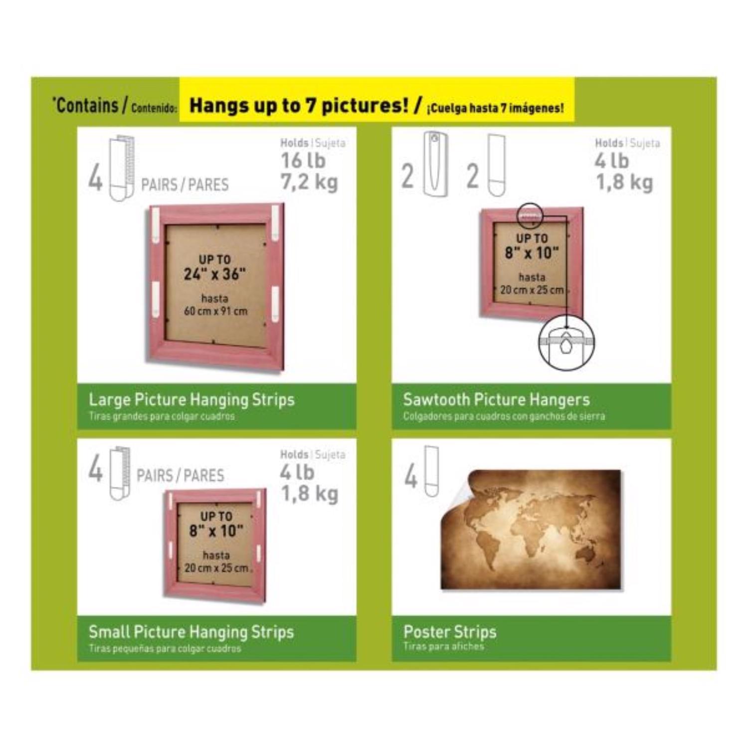 4 pairs large picture hanging strips; 4 pairs small picture hanging strips; 4 poster strips; 2 sawtooth picture hangers; 2 large strips; 1 sticky nail hanger with 2 large strips (web text contains duplication; see images for kit contents)