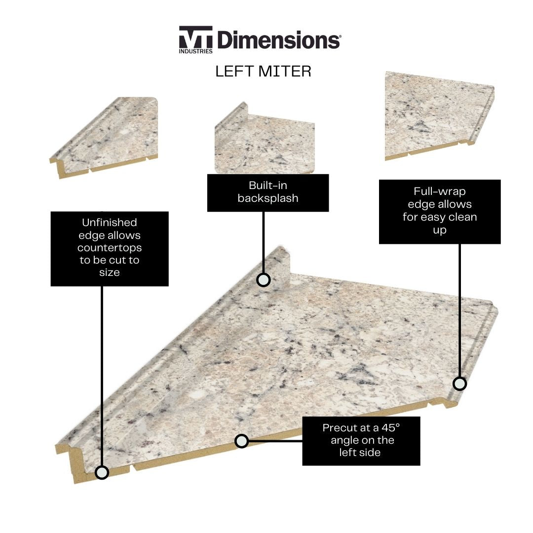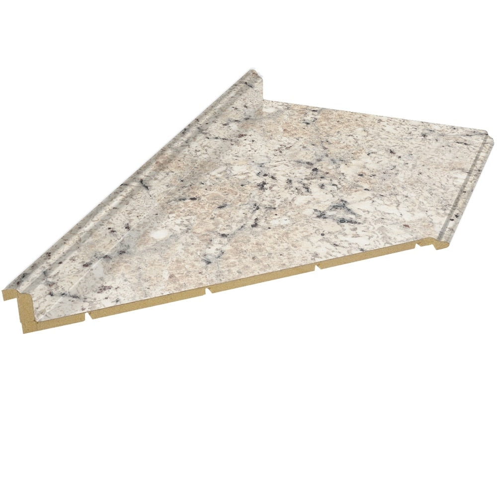 A durable, easy-care laminate countertop featuring Formica’s Ouro Romano design in the Etchings finish with an integrated backsplash and Afton full-wrap ogee edge. Pre-cut left-hand miter simplifies corner installations while offering the look of natural stone at a budget-friendly price.