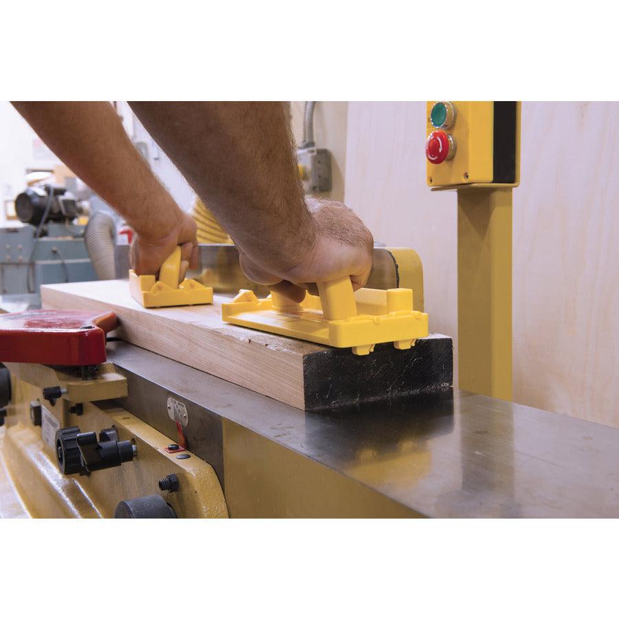 Revolutionary Gravity Heel hooks that grab the end of the work piece and automatically retract mid-board for safer handling on woodworking power machinery