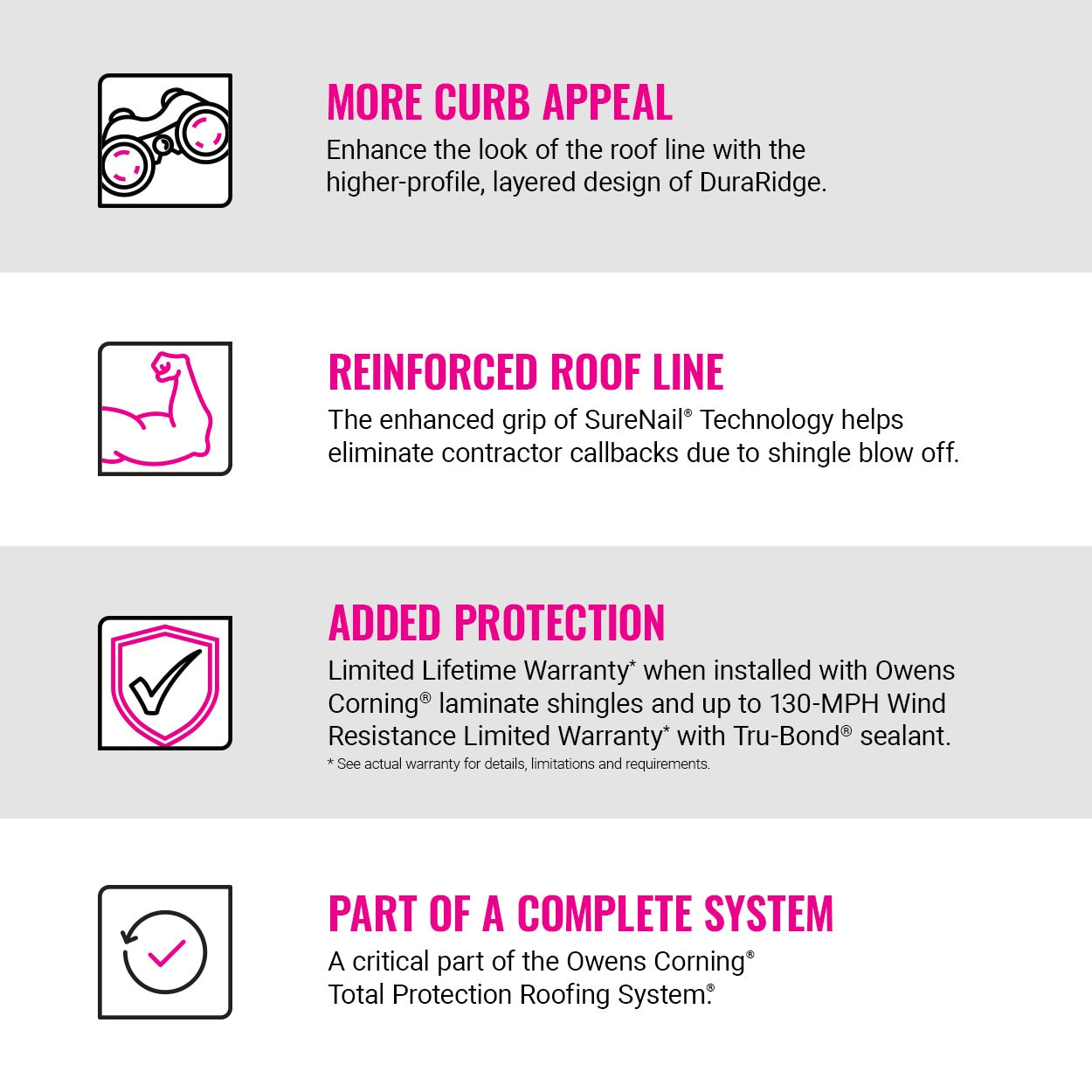 Q: Are they compatible with Owens Corning Duration shingles? A: Yes, DuraRidge is designed to coordinate with Owens Corning laminate shingles, including TruDefinition Duration.
