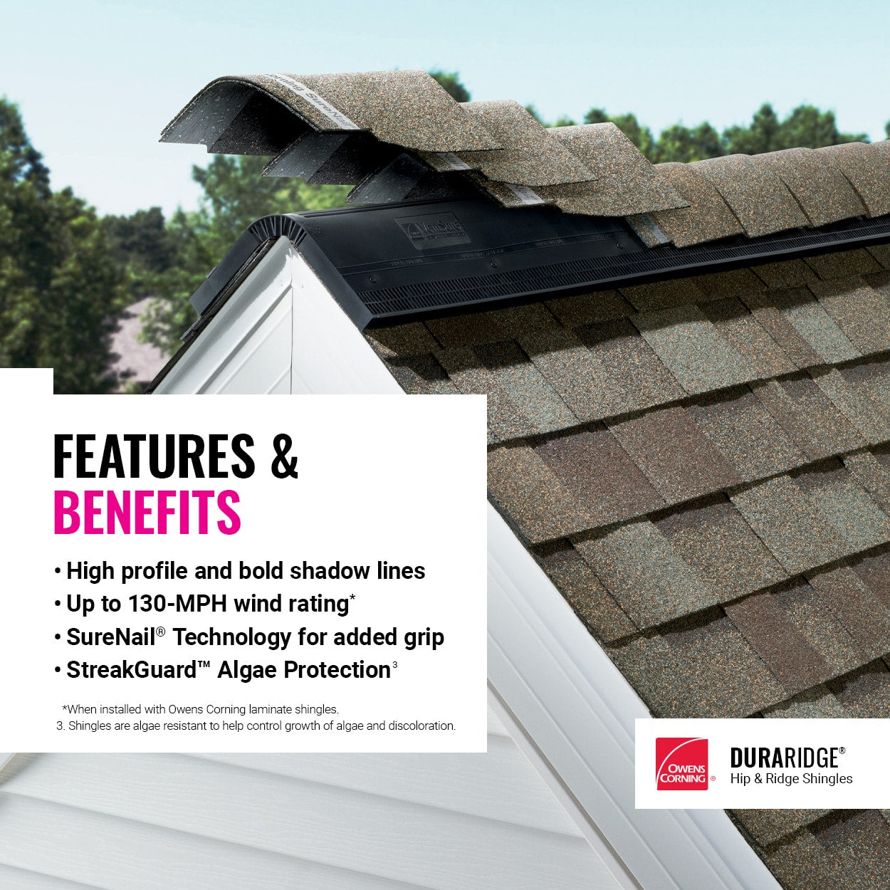 Finish your roof with Owens Corning DuraRidge hip and ridge shingles for a bold, high-profile look and long-lasting protection. Engineered with SureNail Technology and StreakGuard algae resistance, these asphalt shingles deliver strong wind performance up to 130 MPH and coordinate with Owens Corning laminate shingles.