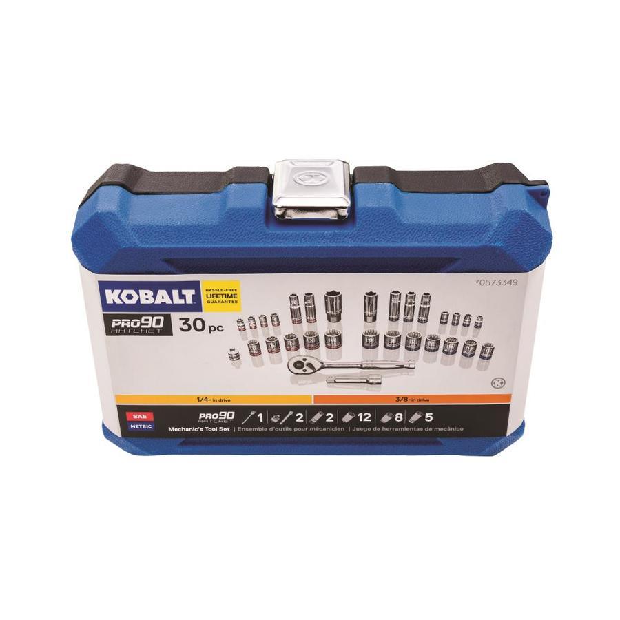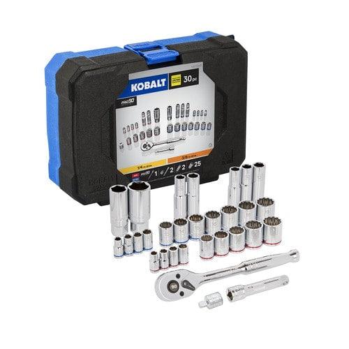 Kobalt 30-piece mechanic’s tool set includes drive tools, sockets, an extension and a quick-release ratchet to tackle automotive repairs or workshop projects