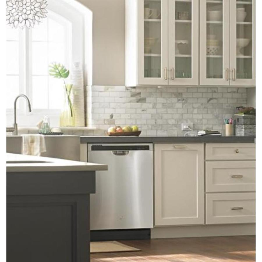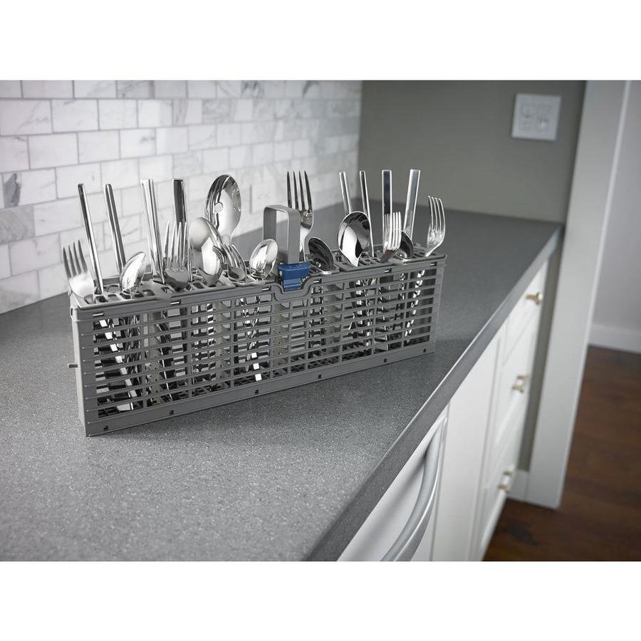 In-door silverware basket frees up rack space by easily fitting on the front of the lower rack or in the door to make room for more dishes