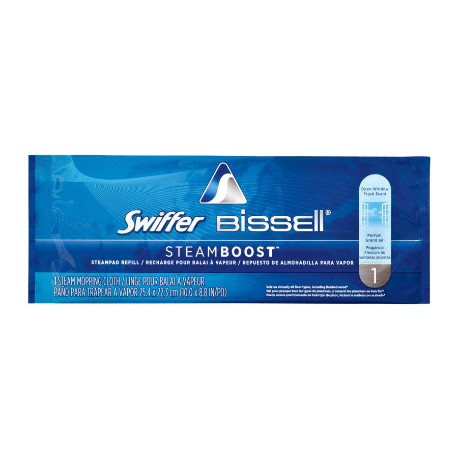 Includes: Swiffer Bissell® SteamBoost™ Kit with 4 disposable pads, 2 washable microfiber pads, 1 carpet glider, and 1 water cup