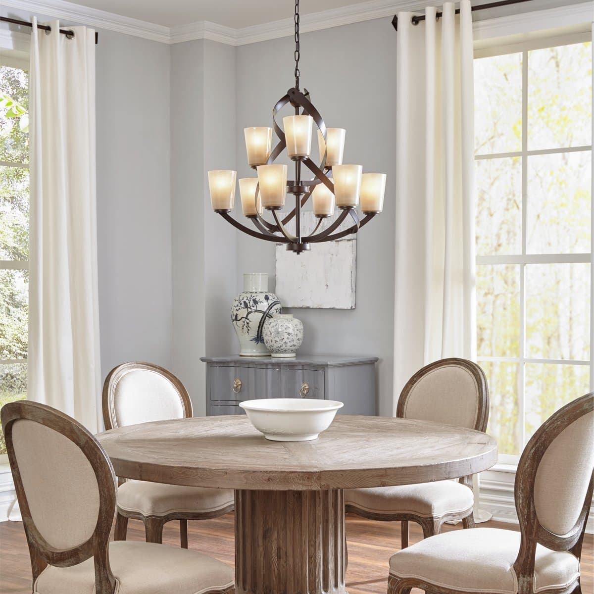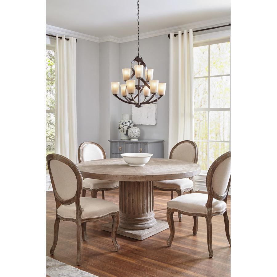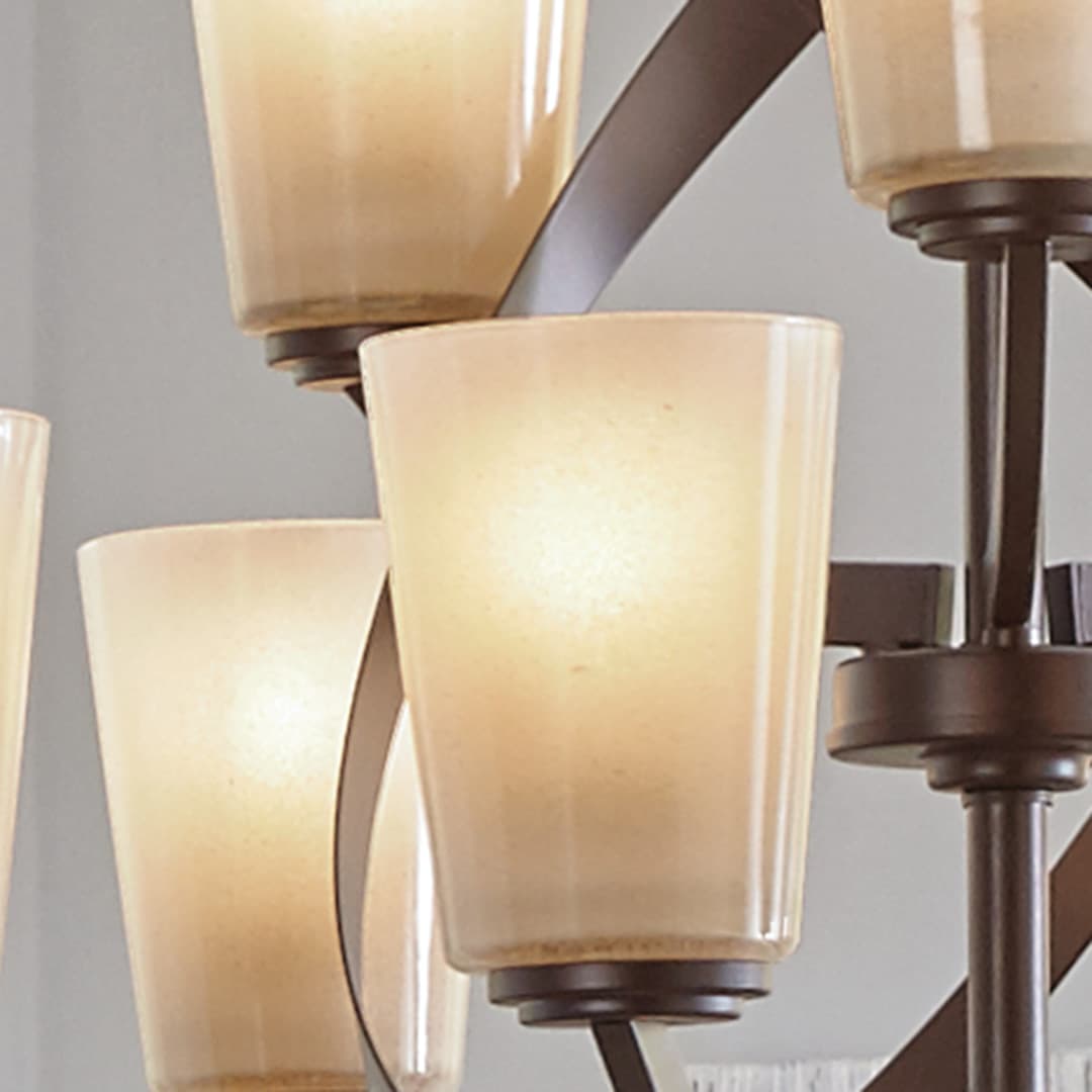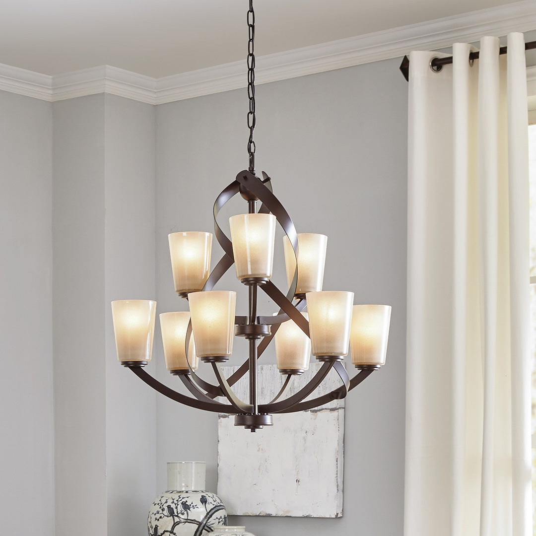 Elevate dining or living spaces with the Kichler Layla chandelier, featuring nine lights and sculptural intersecting arms. Amber-tint piastra glass shades deliver warm, refined illumination in a modern, multi-tier design.