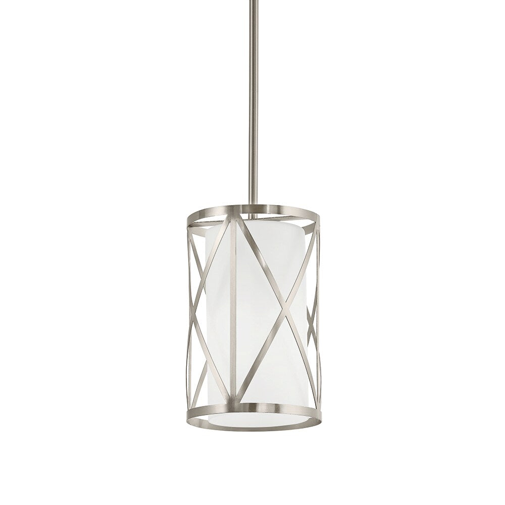 Elevate any room with the Kichler Edenbrook mini pendant, featuring a brushed nickel geometric cage around an etched opal glass cylinder for a warm, diffused glow. Ideal for modern spaces, this hardwired fixture is dimmable and sized perfectly for islands, foyers, or hallways.