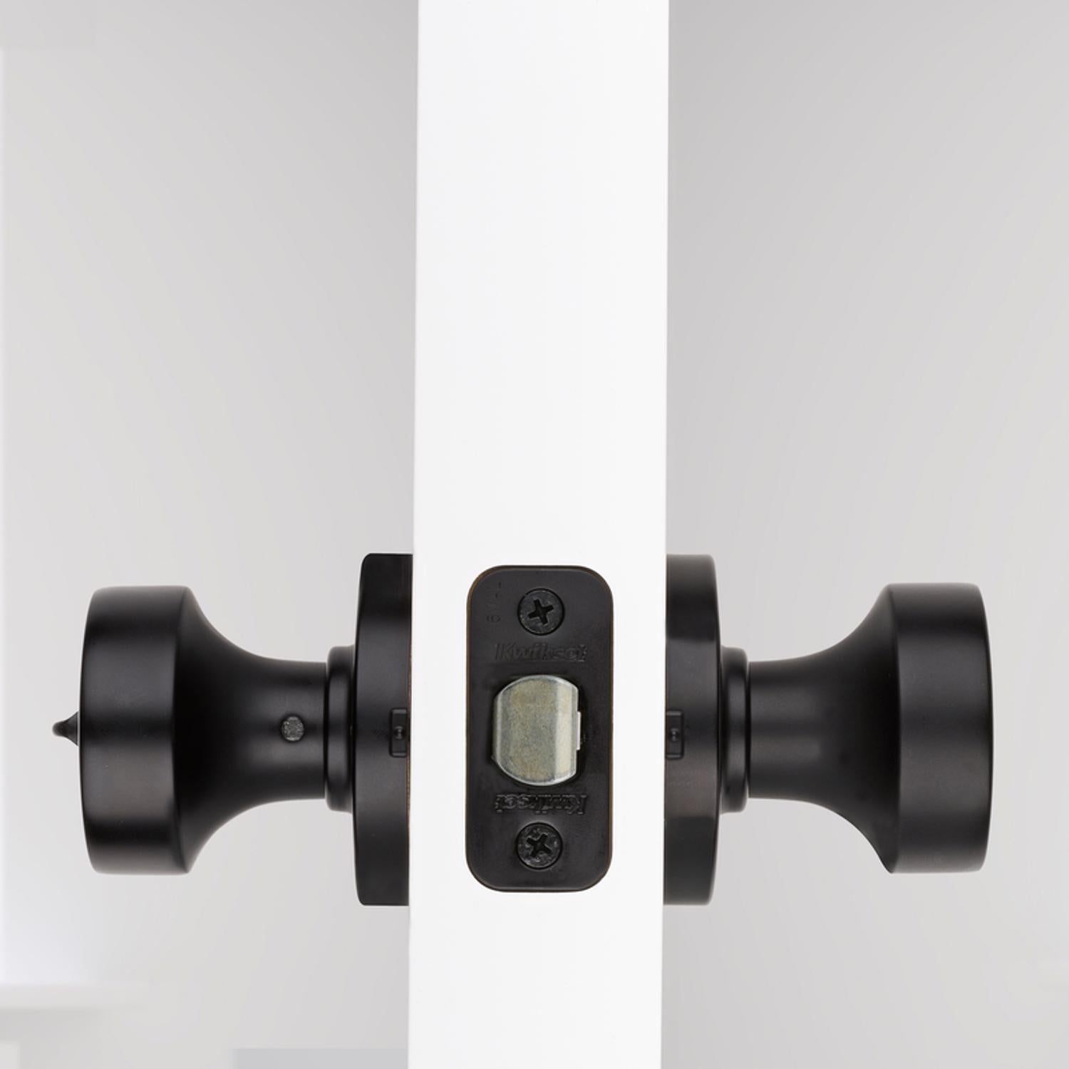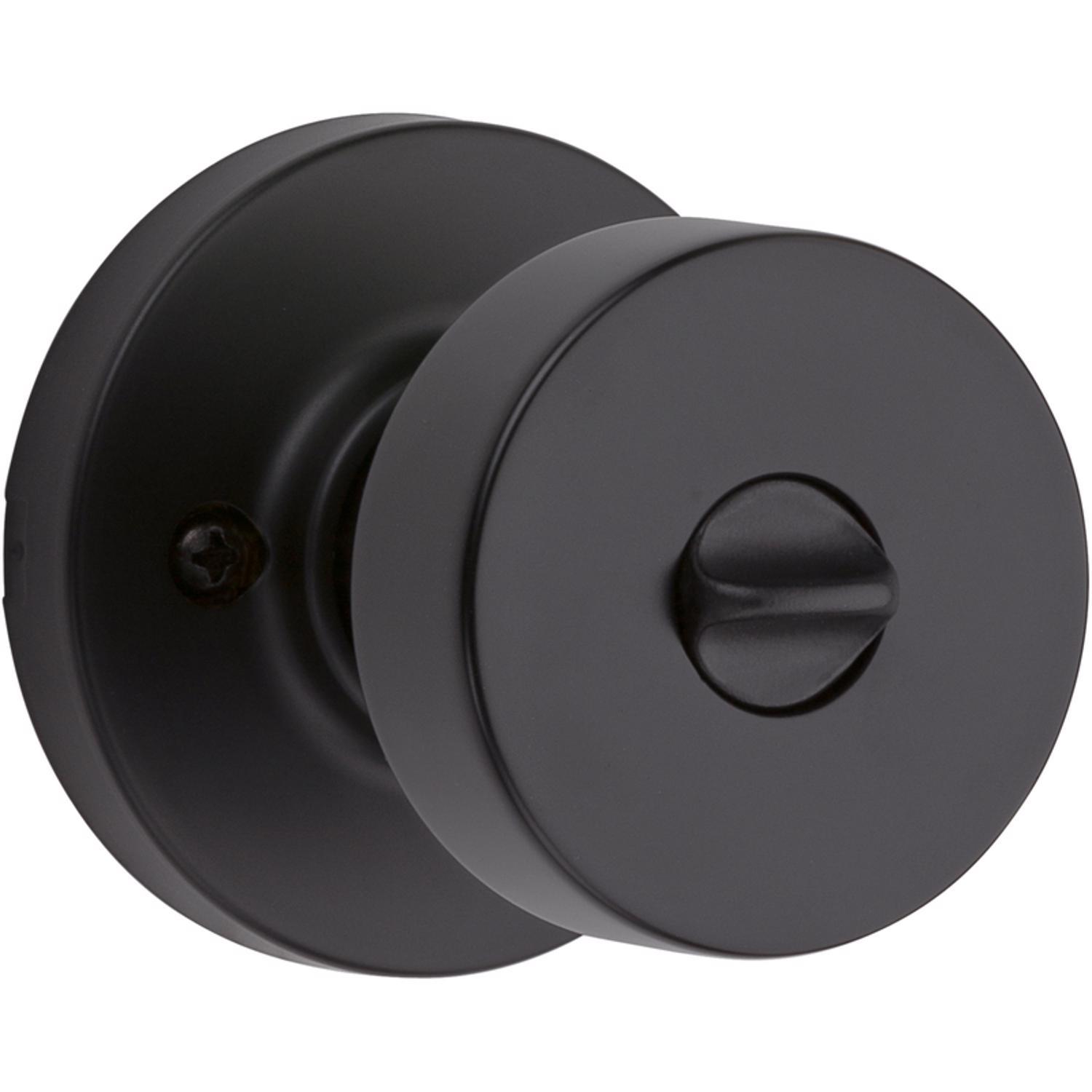 The Kwikset Signature Series Pismo privacy knob delivers clean, modern lines in a rich iron black finish for bedrooms and bathrooms. It features ANSI/BHMA Grade AAA performance, Microban antimicrobial protection, and a universal design that fits standard doors with adjustable backset.