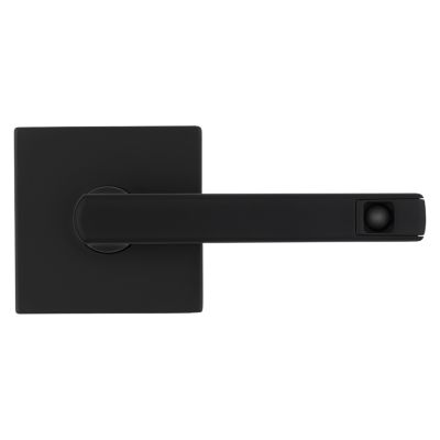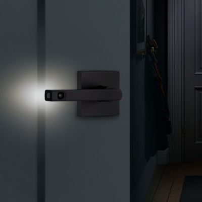 Modern square-rose passage lever from Kwikset’s Halifax collection in Matte Black, designed for hall/closet doors. Features a motion-activated LED to illuminate the handle in low light for safer nighttime navigation.