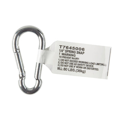 Compact spring snap made of zinc-plated steel for quick connections on keys, tools, and utility items. Corrosion-resistant finish and a 2-inch length with 80 lb working load for everyday tasks. Not for safety or overhead lifting.