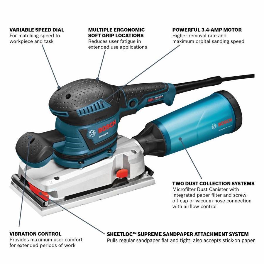 SheetLoc™ Supreme sandpaper attachment system - pulls regular sandpaper flat and tight Powerful 3.4 Amp motor - higher removal rate and maximum orbital sanding speed Vibration Control suspension system - minimizes vibration for superior handling Variable-speed dial - matching speed to workpiece and task for best performance The high-performance microcellular backing pad conforms to many contours Rugged die-cast aluminum gear housing - long-life design eliminates wobble and vibration Two dust collection systems - microfilter dust canister or vacuum hose connection with airflow control Translucent microfilter dust canister - has integrated paper filter and screw-off cap for easy emptying Trigger switch with lock-on button