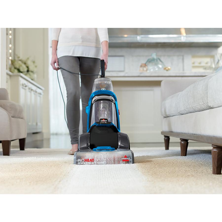 BISSELL carpet shampooer from the ProHeat 2X Revolution series removes stains from carpets and upholstery Antibacterial cleaning kills odor-causing bacteria Includes rotating brush, carpet glider, concentrator nozzle, extend hose and nozzle cleaning tool 22-ft power cord allows for extended reach without having to unplug Lightweight 18-lb design and low-profile foot offer easy maneuverability and cleaning around and under furniture 3-year limited warranty gives you peace of mind Variable cleaning modes include Deep Clean mode to remove deep down dirt and Express Clean mode for quicker cleaning Approximate 1-hour dry time with powerful surround suction gets the job done fast