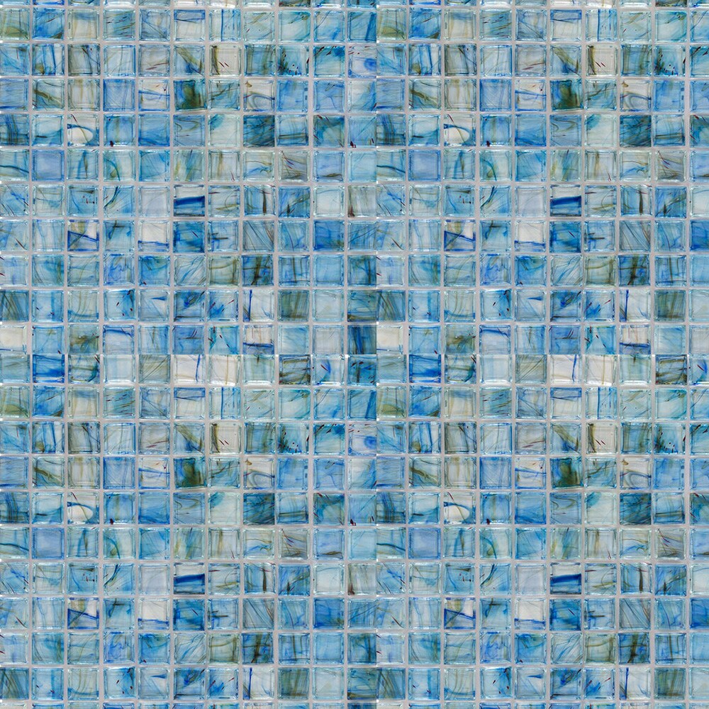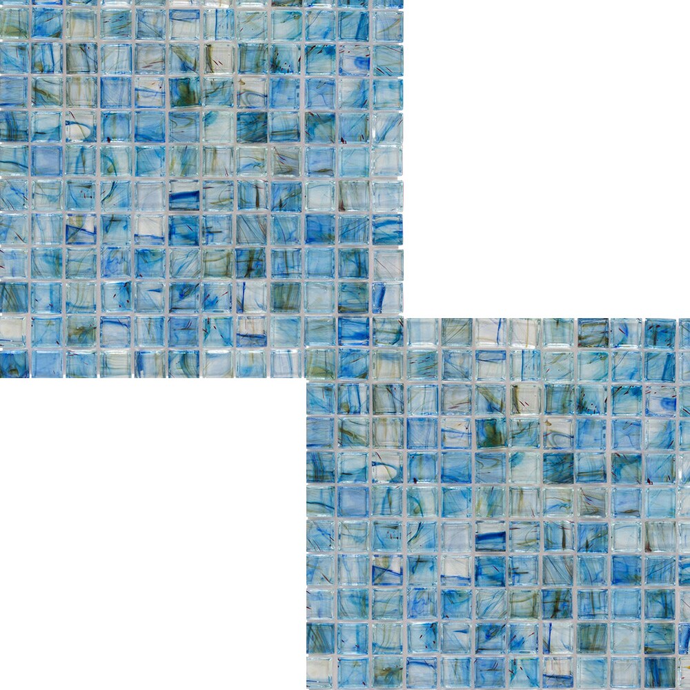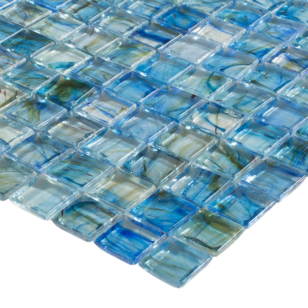 A vibrant lagoon blue glass mosaic tile in uniform square pattern adds a modern, jewel-like finish to backsplashes, showers, and accent walls. Each 12-in x 12-in sheet features glossy, smooth glass suitable for indoor or outdoor wall applications.