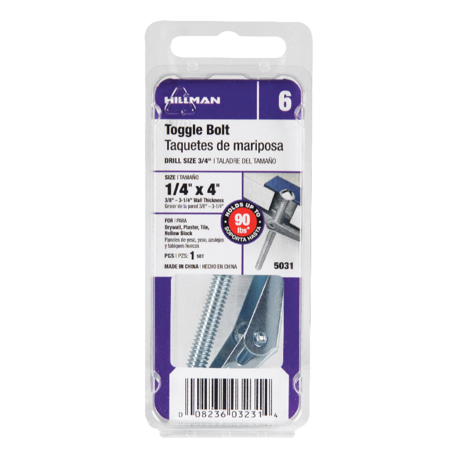 Heavy-duty Hillman toggle bolt anchors securely in hollow walls like drywall, plaster, tile, and hollow block. Zinc-plated steel construction with spring-action wings provides a firm hold and distributes load over a large area for reliable support.