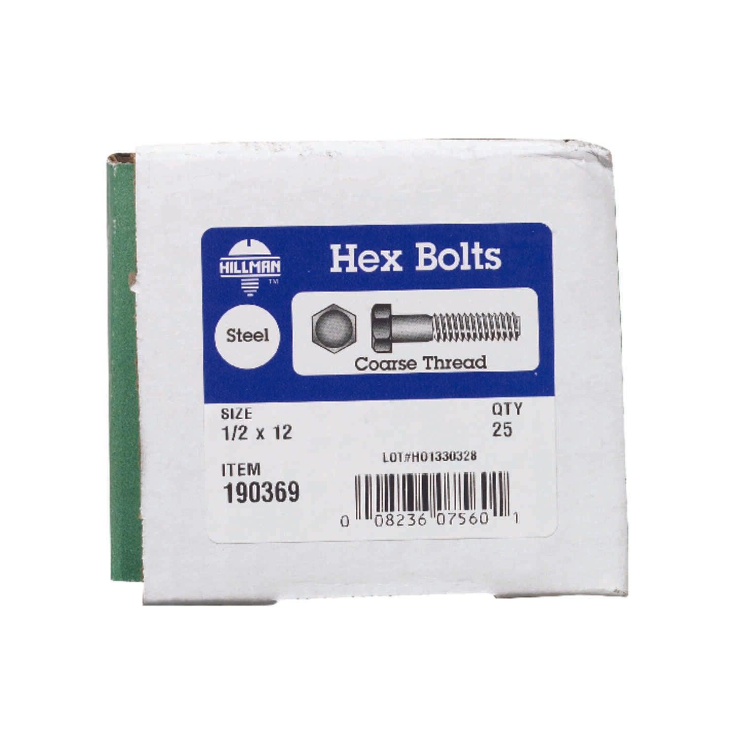 Hillman 1/2 in. Diameter x 12 in. Length Zinc-Plated Steel Hex Bolt, Coarse Thread, 25-Pack