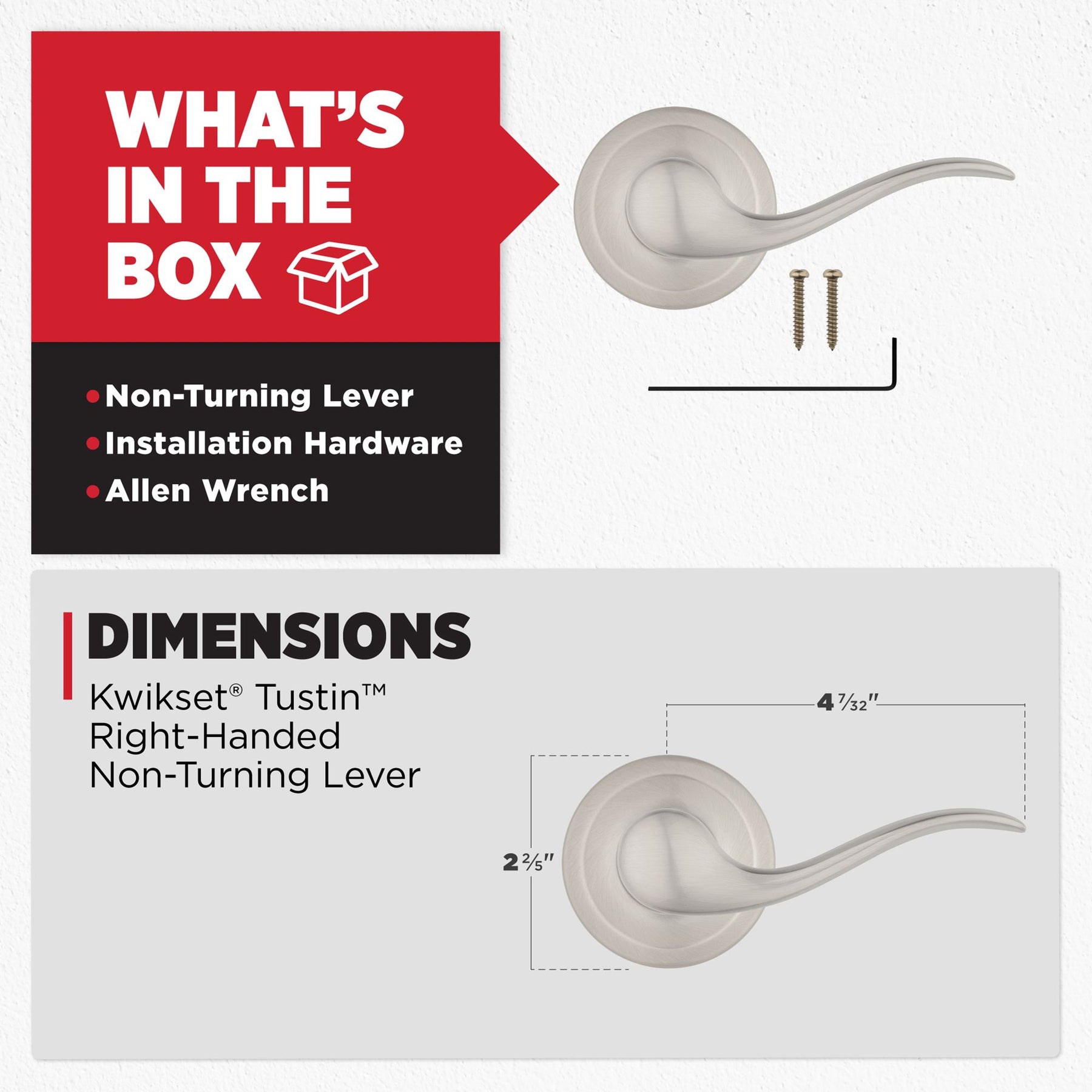 The Kwikset Tustin right-handed dummy lever offers a smooth, wave-inspired handle in a durable Satin Nickel finish for push/pull applications on interior doors. Part of the Signature Series, it installs quickly with included hardware and features Microban antimicrobial protection.