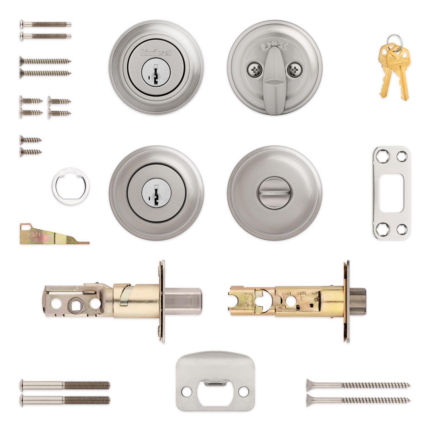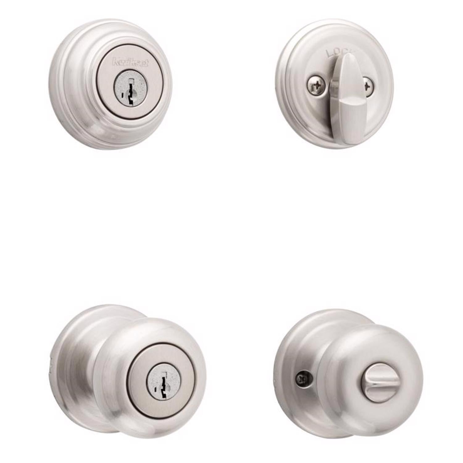 Upgrade exterior door security with the Kwikset Juno combo pack, featuring a satin nickel keyed entry knob paired with a single cylinder deadbolt. SmartKey Security lets you re-key the lock yourself in seconds, while the durable all-metal construction meets ANSI/BHMA Grade 2 standards for reliable performance.