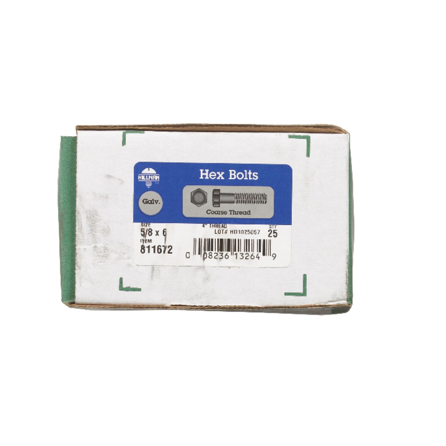Hillman 5/8 in. Diameter x 6 in. Length Hot-Dipped Galvanized Steel Hex Bolt, Coarse Thread, 25-Pack