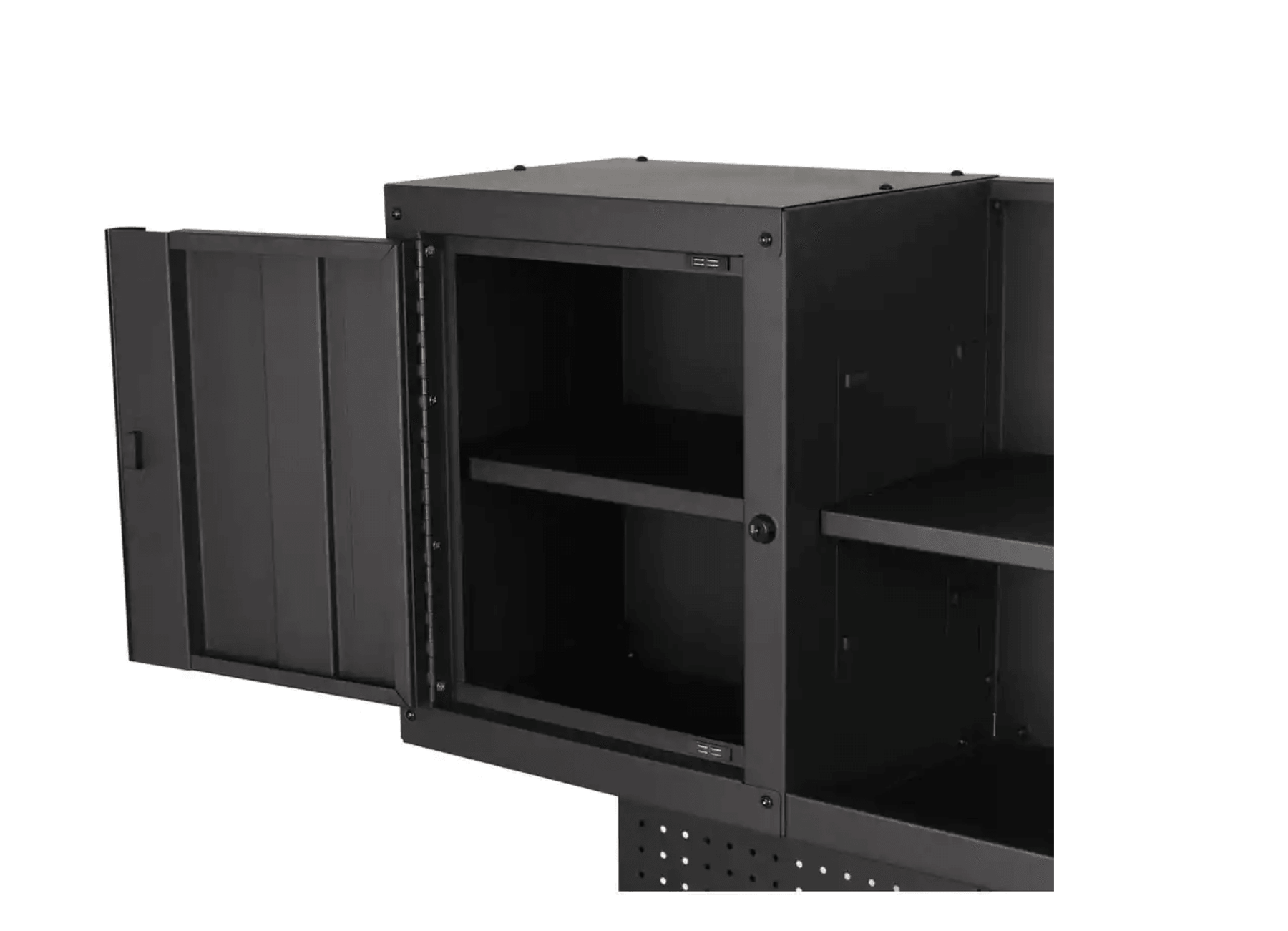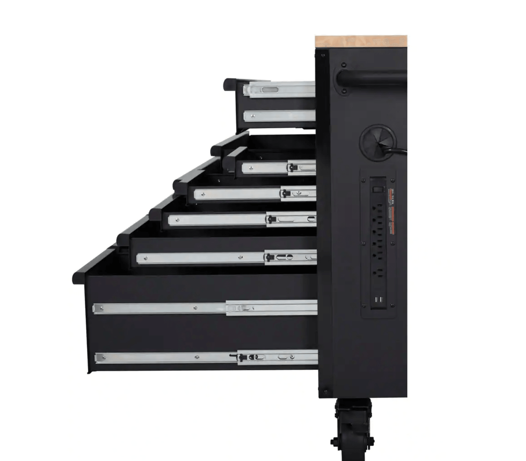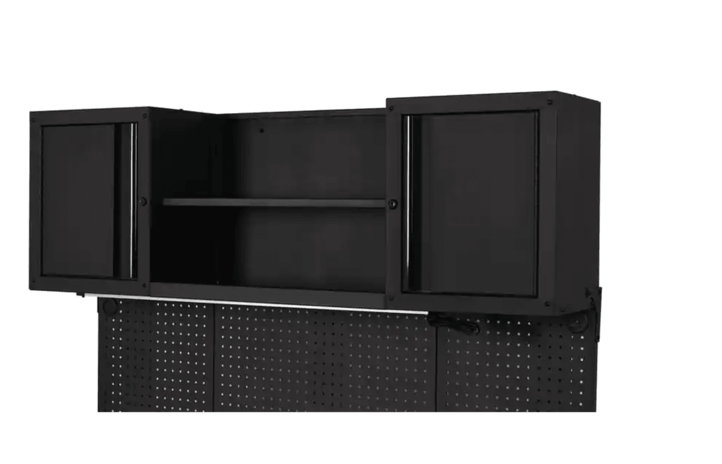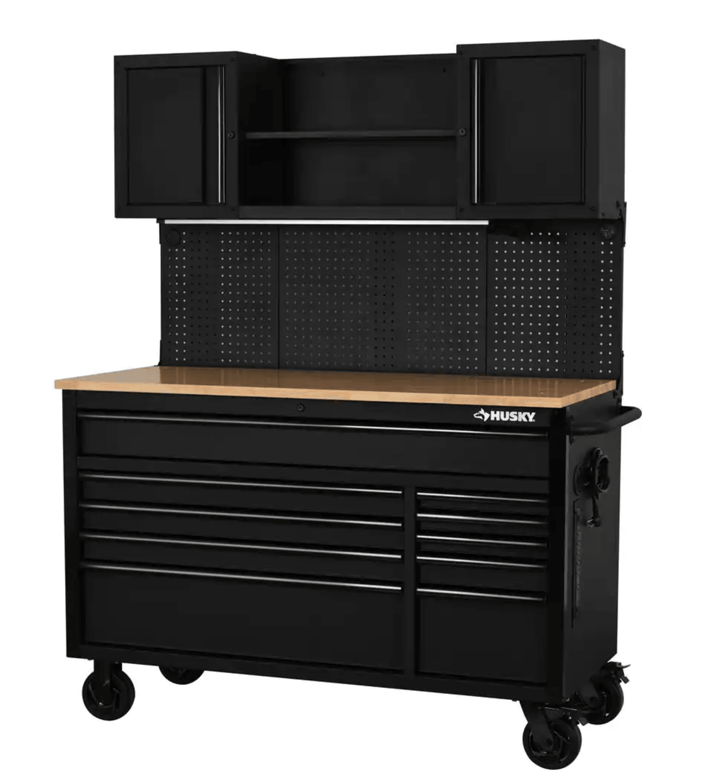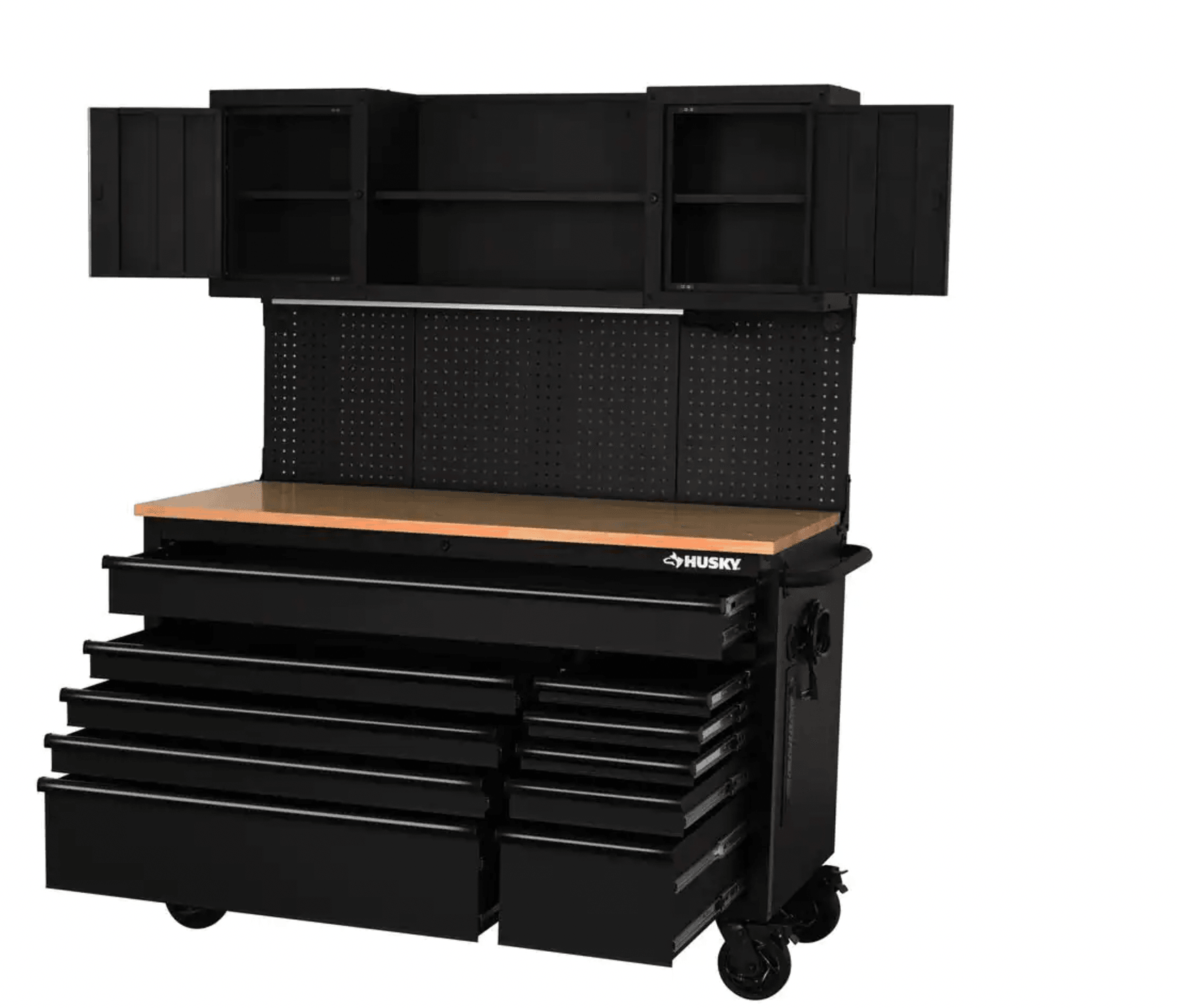 56 in. W x 27.6 in. D 10-Drawer Matte Black Heavy-Duty Mobile Workbench with Pegboard and Top Cabinet