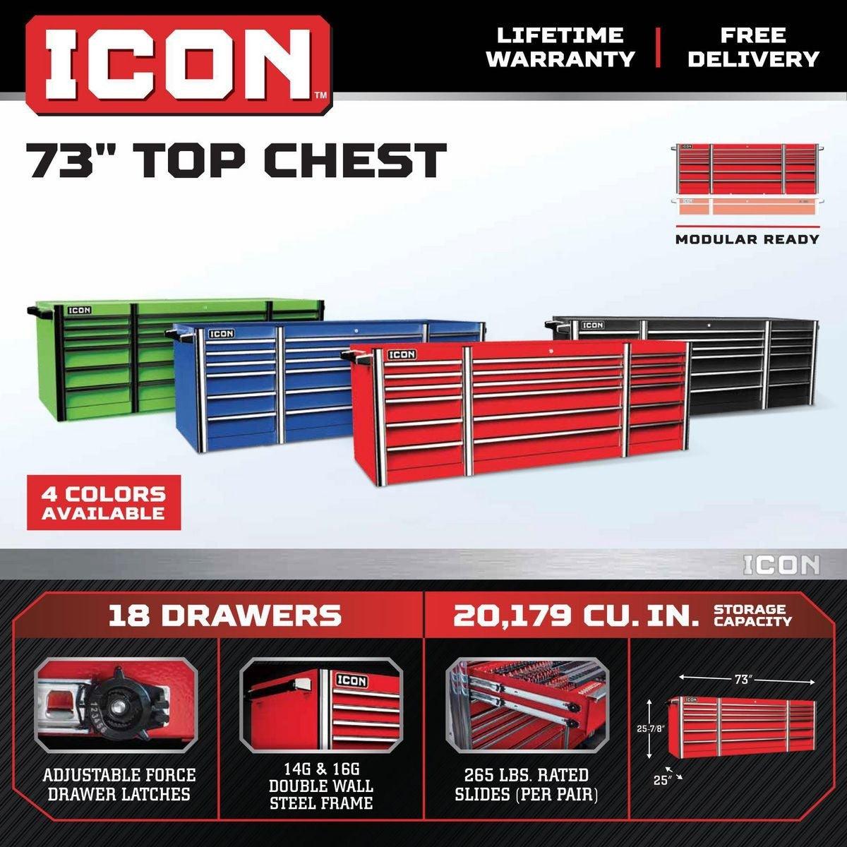 The Icon™ Professional Top Chest provides even more storage and drawer space, again, with the same construction and drawer slides found in the base cabinets. All Icon™ storage comes with free door-to-door delivery and a lifetime warranty—plus, a full line of replacement parts is available. It’s the only storage solution you’ll ever need.