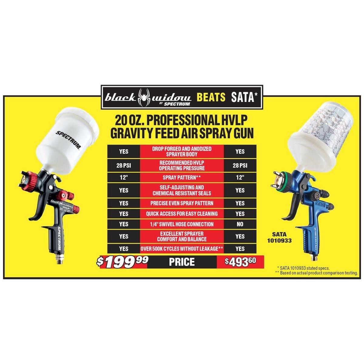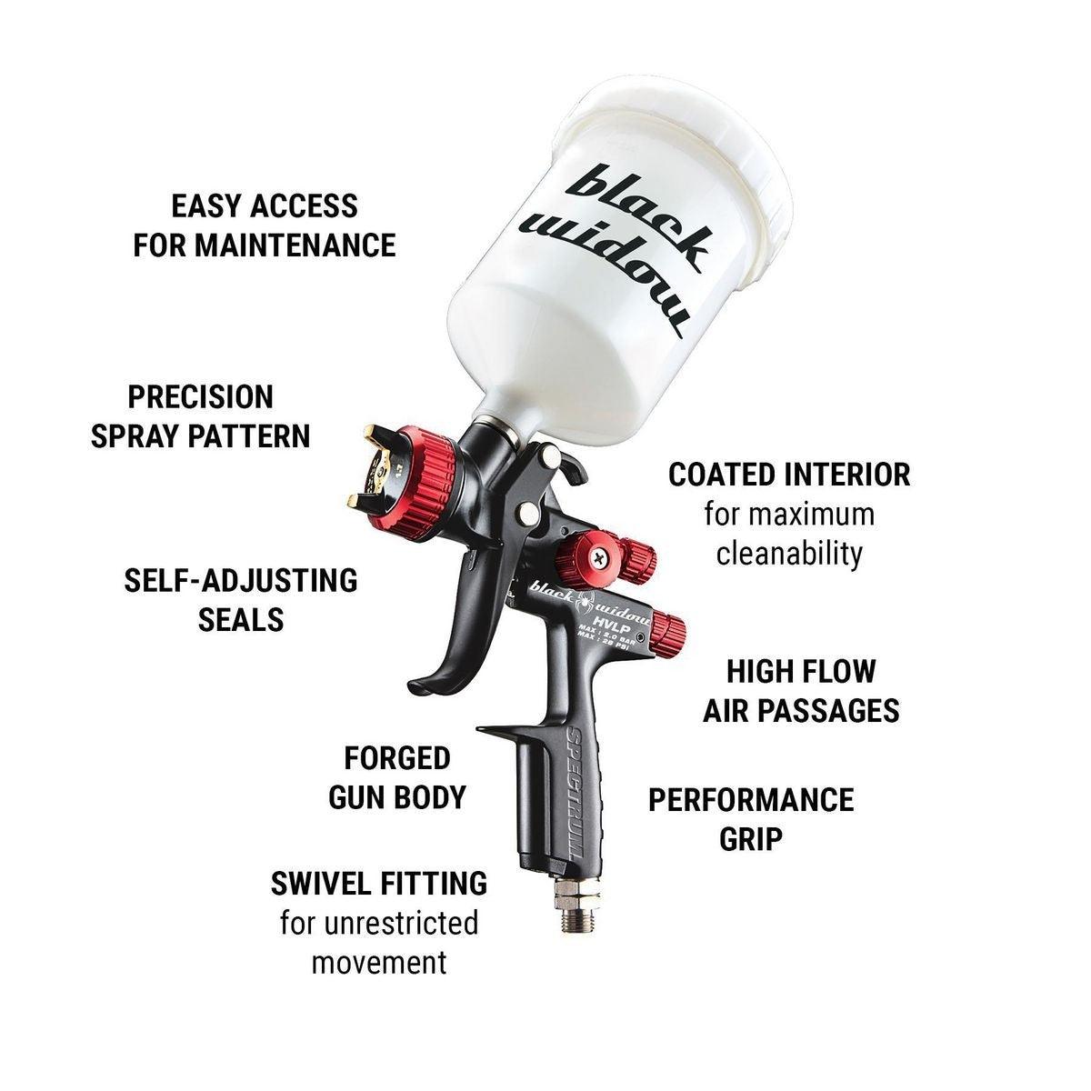 The Black Widow™ HVLP Spray Gun by Black Widow™ delivers a precision spray pattern for professional results with primer and base coats. An exclusive Quick Clean gun body makes clean-up easier and reduces down time. The gun interior is coated to prevent material adhesion for superior flow and easier cleaning.