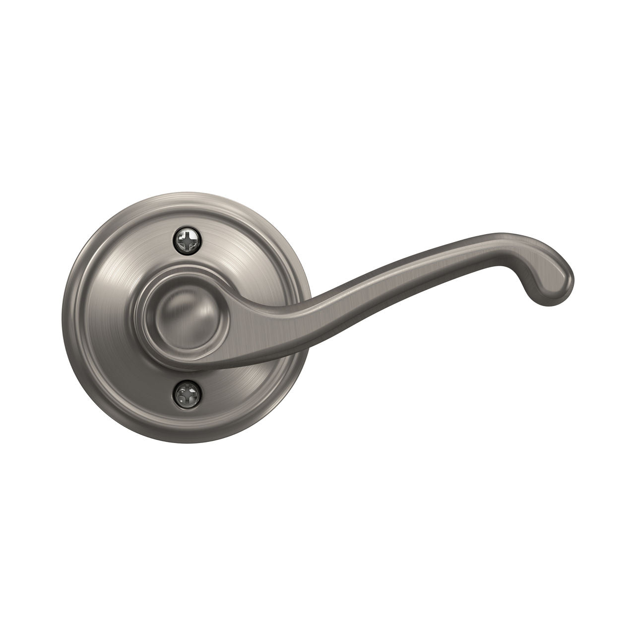 A non-turning, surface-mounted decorative lever for doors without bore holes or latches. The Schlage Flair dummy lever features premium metal construction, right-hand handing, and a Satin Nickel finish to coordinate throughout the home.