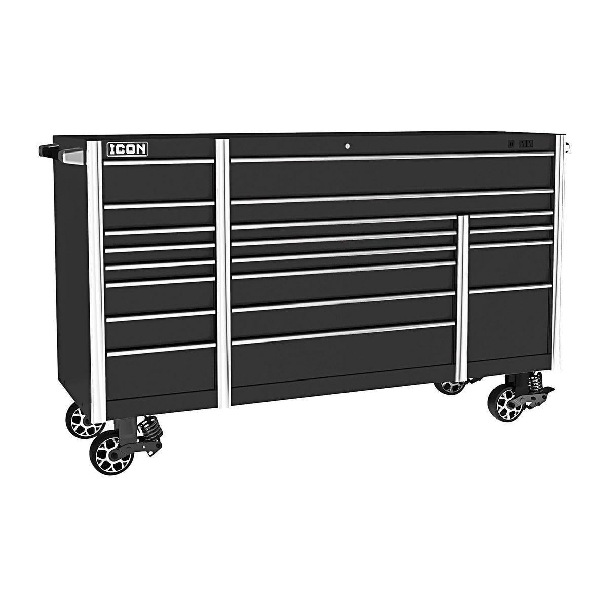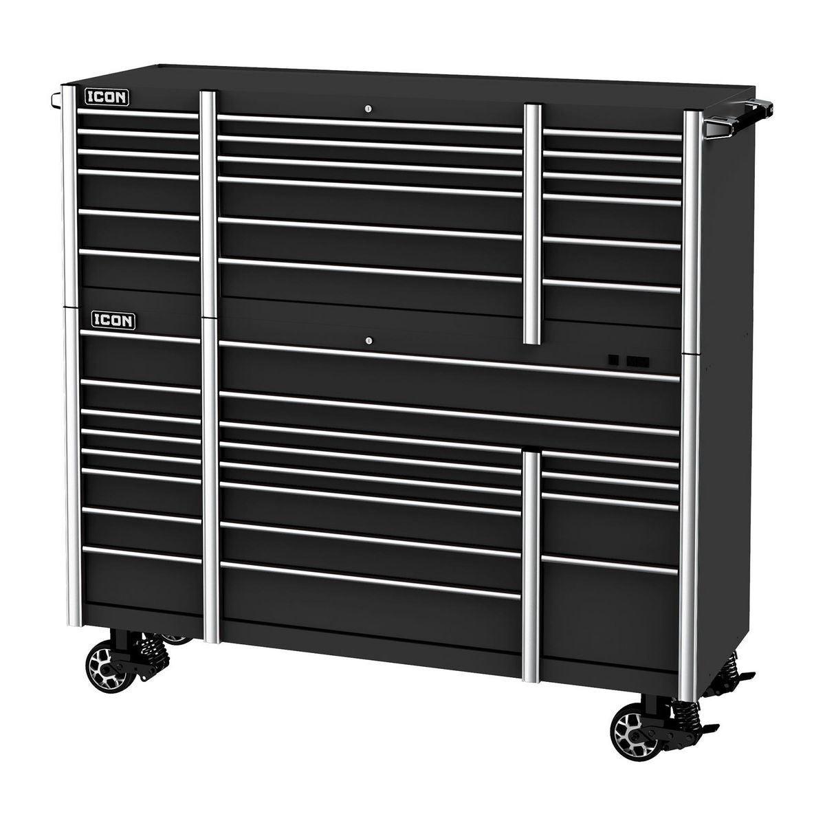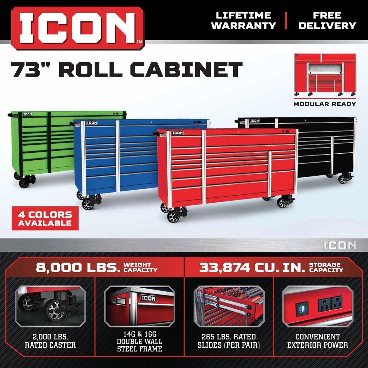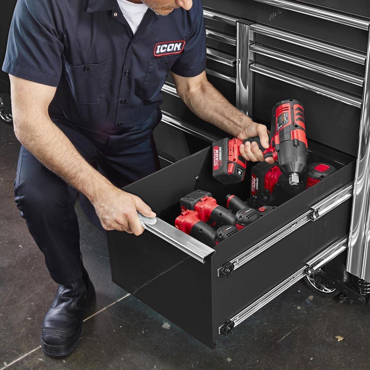 Built with the strongest steel and precision reinforced welds, Icon™ storage is tough enough for the daily grind of a busy shop…and you don’t have to break the bank to get the tool cabinet you deserve. Every Icon™ cabinet features a double-wall steel frame for ultimate strength. Industry-leading 16-gauge top and outside panels prevent dents and withstand the demands of daily use, and 18-gauge inside panels evenly support drawer and slide weight. Structural corner brackets prevent cabinet twist and racking. Under every Icon™ roller cabinet, three 14-gauge U channels distribute weight evenly to the industry-leading 2,000-pound-rated suspension casters with easy locks, so these boxes glide into place easily and stay in place securely. With a staggering 8,000-pound capacity, Icon™ roller cabinets are more than double the overall weight capacity of comparably sized Snap-On cabinets. These boxes are beautiful. Their premium ultra-tough powder-coat finish will withstand harsh chemicals and provide a showroom finish that looks like new, even after years of punishing use. Every drawer features the highest-quality ball bearing full extension drawer slides that support up to 265 pounds per set - or 530 pounds for drawers with double slides - even more than Snap-On’s Masters Series. An adjustable-force drawer latch system lets you dial-in just the right amount of force to keep drawers from opening when they should be closed. And heavy-duty non-slip drawer liners will keep your tools in place...right where you put them. Icon™ storage features an integrated power system. The power charging drawer has two fast-charging USBs and six 110v outlets with extendable chain-style power management. The deep power tool drawer includes six adjustable height holsters for easy access to air and power tools. Interior and exterior electrical outlets and USB ports give you easy access to power when and where you need it. We even designed a detachable power supply so you can move the cabinet without dragging the cord. And a Y-cord comes with the base cabinet so when you add a work center, you only have to plug in the cabinet once. An advanced locking system turns your tool cabinet into a vault to keep your valuable tools safe and secure. The interchangeable core lock comes with security milled keys that allow you to key-alike all your Icon™ storage units as you expand. Icon™’s modular design offers endless configurations for maximum flexibility so the system can grow with your needs. Customize your storage with expansion options like work centers, end lockers, end cabinets, overhead storage and top chests. The base cabinets are offered in three sizes - 36, 56 and 73 inches. And all Icon™ storage comes in four colors: Red, Blue, Black and Green. All Icon™ storage comes with free door-to-door delivery and a lifetime warranty—plus, a full line of replacement parts is available. It’s the only storage solution you’ll ever need.