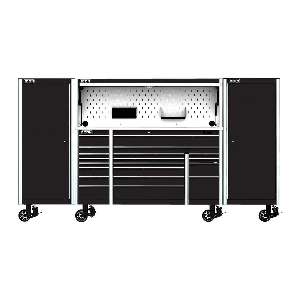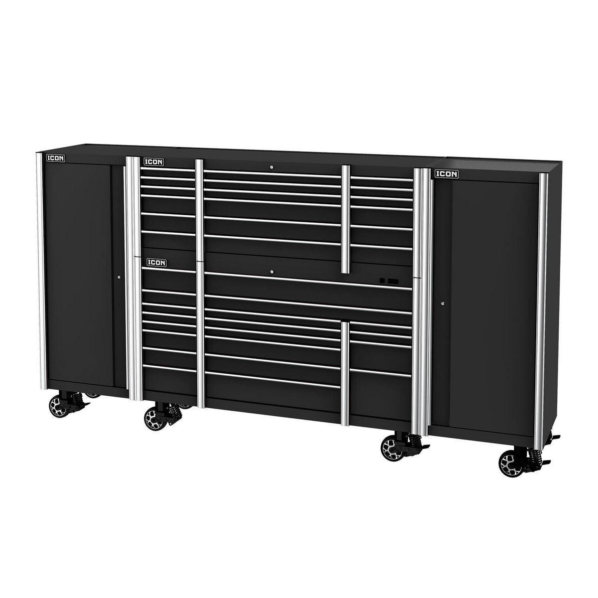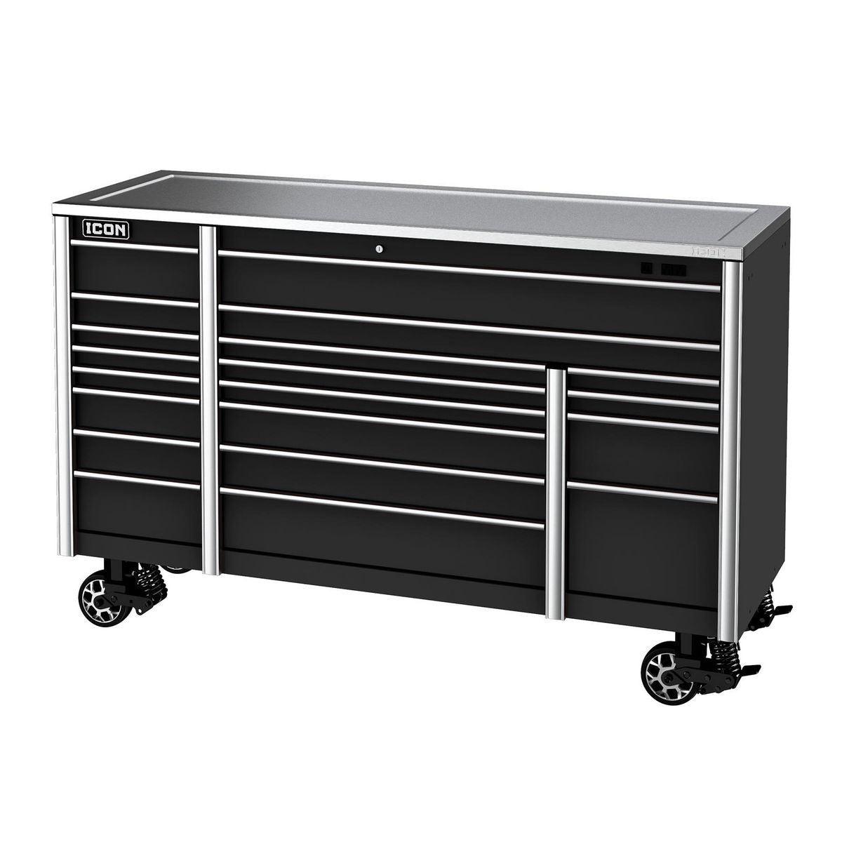 Built with the strongest steel and precision reinforced welds, Icon™ storage is tough enough for the daily grind of a busy shop…and you don’t have to break the bank to get the tool cabinet you deserve. Every Icon™ cabinet features a double-wall steel frame for ultimate strength. Industry-leading 16-gauge top and outside panels prevent dents and withstand the demands of daily use, and 18-gauge inside panels evenly support drawer and slide weight. Structural corner brackets prevent cabinet twist and racking. Under every Icon™ roller cabinet, three 14-gauge U channels distribute weight evenly to the industry-leading 2,000-pound-rated suspension casters with easy locks, so these boxes glide into place easily and stay in place securely. With a staggering 8,000-pound capacity, Icon™ roller cabinets are more than double the overall weight capacity of comparably sized Snap-On cabinets. These boxes are beautiful. Their premium ultra-tough powder-coat finish will withstand harsh chemicals and provide a showroom finish that looks like new, even after years of punishing use. Every drawer features the highest-quality ball bearing full extension drawer slides that support up to 265 pounds per set - or 530 pounds for drawers with double slides - even more than Snap-On’s Masters Series. An adjustable-force drawer latch system lets you dial-in just the right amount of force to keep drawers from opening when they should be closed. And heavy-duty non-slip drawer liners will keep your tools in place...right where you put them. Icon™ storage features an integrated power system. The power charging drawer has two fast-charging USBs and six 110v outlets with extendable chain-style power management. The deep power tool drawer includes six adjustable height holsters for easy access to air and power tools. Interior and exterior electrical outlets and USB ports give you easy access to power when and where you need it. We even designed a detachable power supply so you can move the cabinet without dragging the cord. And a Y-cord comes with the base cabinet so when you add a work center, you only have to plug in the cabinet once. An advanced locking system turns your tool cabinet into a vault to keep your valuable tools safe and secure. The interchangeable core lock comes with security milled keys that allow you to key-alike all your Icon™ storage units as you expand. Icon™’s modular design offers endless configurations for maximum flexibility so the system can grow with your needs. Customize your storage with expansion options like work centers, end lockers, end cabinets, overhead storage and top chests. The base cabinets are offered in three sizes - 36, 56 and 73 inches. And all Icon™ storage comes in four colors: Red, Blue, Black and Green. All Icon™ storage comes with free door-to-door delivery and a lifetime warranty—plus, a full line of replacement parts is available. It’s the only storage solution you’ll ever need.
