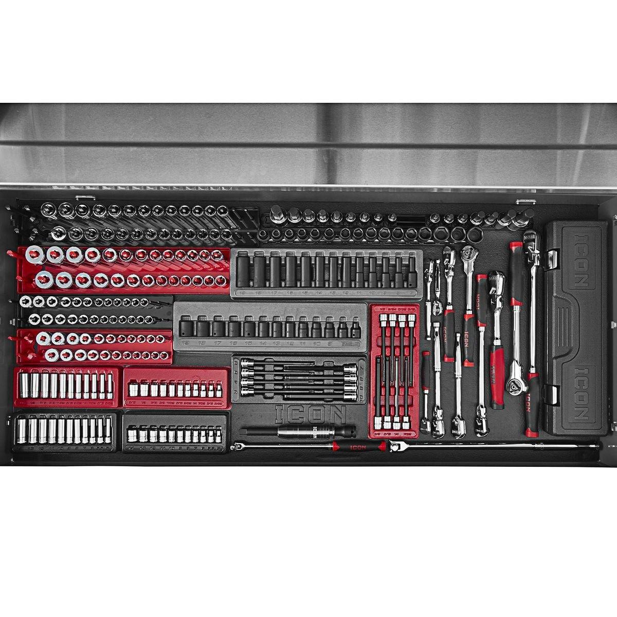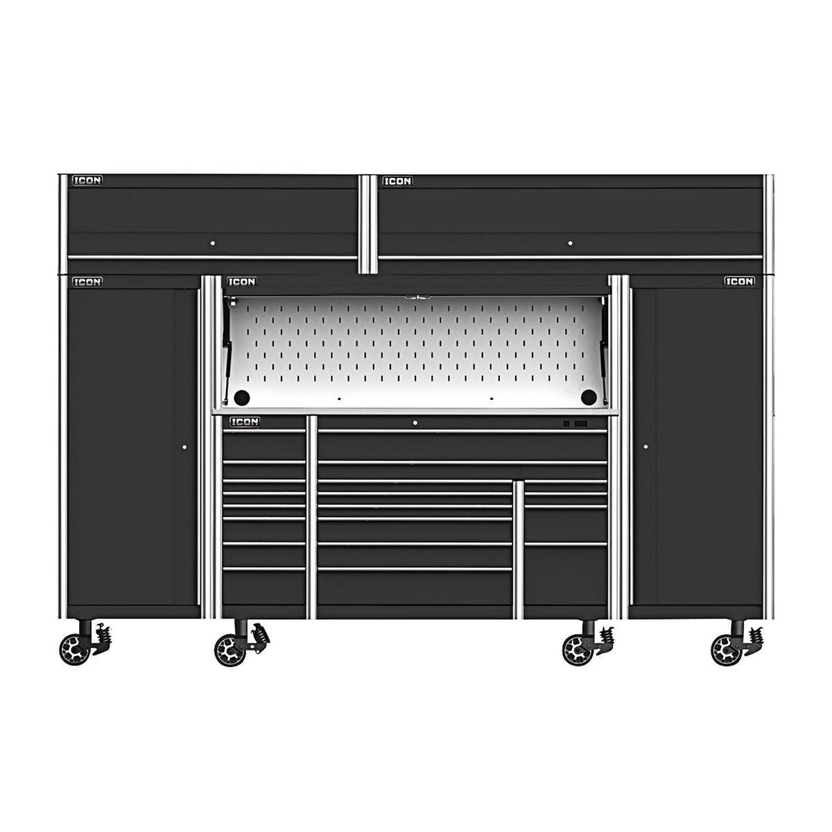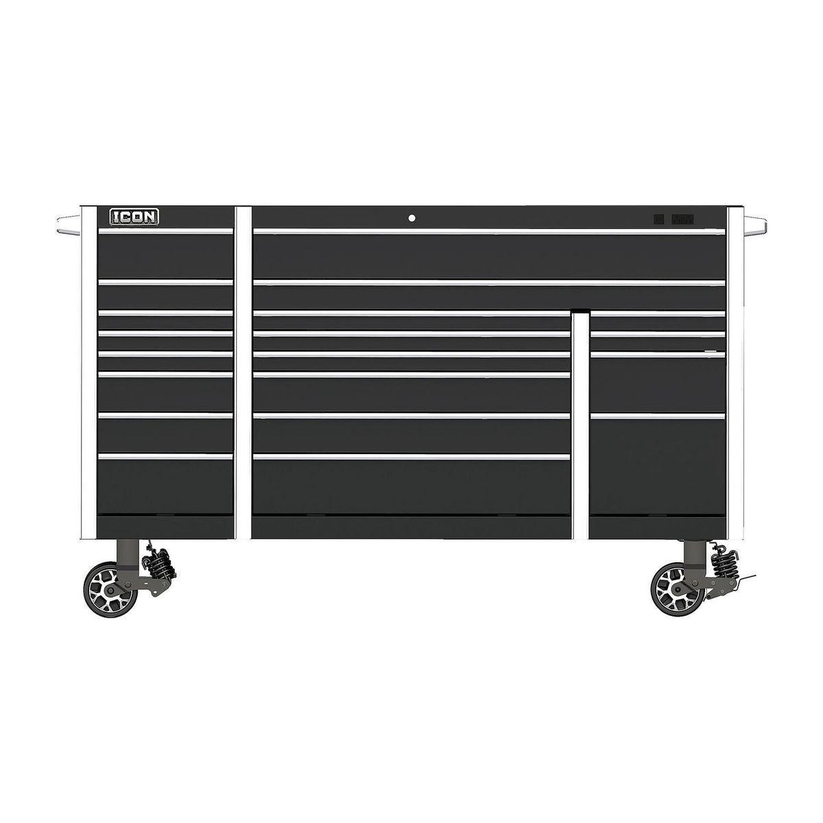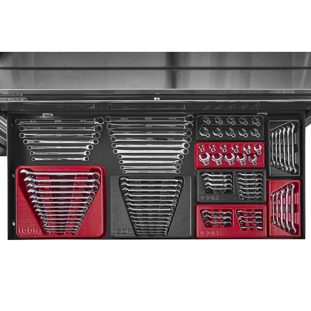 Built with the strongest steel and precision reinforced welds, Icon™ storage is tough enough for the daily grind of a busy shop…and you don’t have to break the bank to get the tool cabinet you deserve. Every Icon™ cabinet features a double-wall steel frame for ultimate strength. Industry-leading 16-gauge top and outside panels prevent dents and withstand the demands of daily use, and 18-gauge inside panels evenly support drawer and slide weight. Structural corner brackets prevent cabinet twist and racking. Under every Icon™ roller cabinet, three 14-gauge U channels distribute weight evenly to the industry-leading 2,000-pound-rated suspension casters with easy locks, so these boxes glide into place easily and stay in place securely. With a staggering 8,000-pound capacity, Icon™ roller cabinets are more than double the overall weight capacity of comparably sized Snap-On cabinets. These boxes are beautiful. Their premium ultra-tough powder-coat finish will withstand harsh chemicals and provide a showroom finish that looks like new, even after years of punishing use. Every drawer features the highest-quality ball bearing full extension drawer slides that support up to 265 pounds per set - or 530 pounds for drawers with double slides - even more than Snap-On’s Masters Series. An adjustable-force drawer latch system lets you dial-in just the right amount of force to keep drawers from opening when they should be closed. And heavy-duty non-slip drawer liners will keep your tools in place...right where you put them. Icon™ storage features an integrated power system. The power charging drawer has two fast-charging USBs and six 110v outlets with extendable chain-style power management. The deep power tool drawer includes six adjustable height holsters for easy access to air and power tools. Interior and exterior electrical outlets and USB ports give you easy access to power when and where you need it. We even designed a detachable power supply so you can move the cabinet without dragging the cord. And a Y-cord comes with the base cabinet so when you add a work center, you only have to plug in the cabinet once. An advanced locking system turns your tool cabinet into a vault to keep your valuable tools safe and secure. The interchangeable core lock comes with security milled keys that allow you to key-alike all your Icon™ storage units as you expand. Icon™’s modular design offers endless configurations for maximum flexibility so the system can grow with your needs. Customize your storage with expansion options like work centers, end lockers, end cabinets, overhead storage and top chests. The base cabinets are offered in three sizes - 36, 56 and 73 inches. And all Icon™ storage comes in four colors: Red, Blue, Black and Green. All Icon™ storage comes with free door-to-door delivery and a lifetime warranty—plus, a full line of replacement parts is available. It’s the only storage solution you’ll ever need.