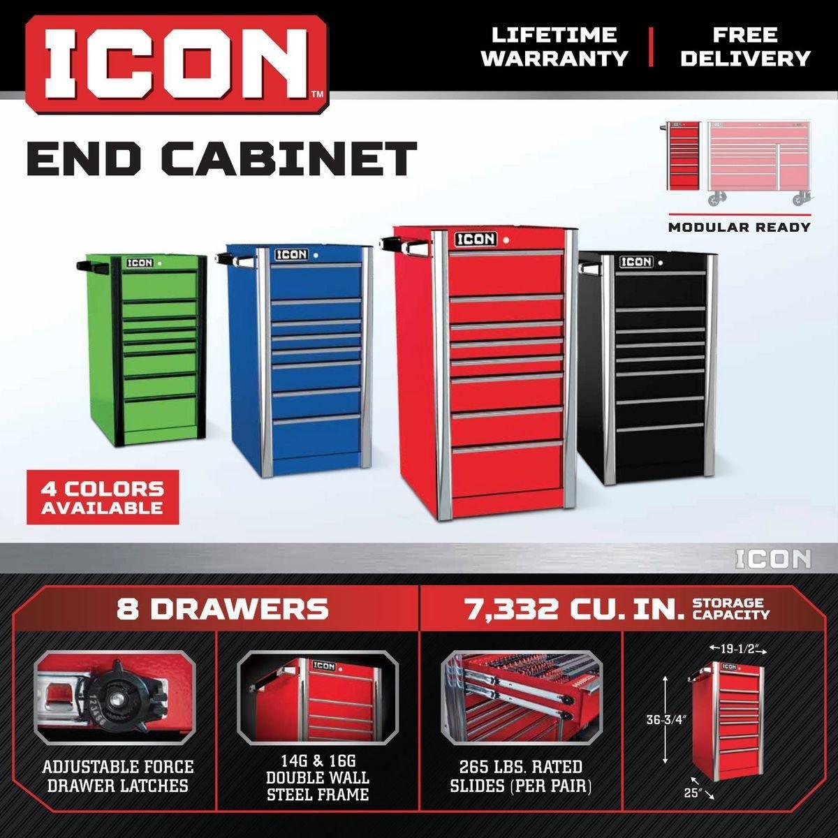 With an Icon™ Professional 22 in. End Cabinet, you can expand your tool box with 8 additional drawers that have the same quality construction and drawer slides found in the base cabinets—and they can be mounted on either side. All Icon™ storage comes with free door-to-door delivery and a lifetime warranty—plus, a full line of replacement parts is available. It’s the only storage solution you’ll ever need.