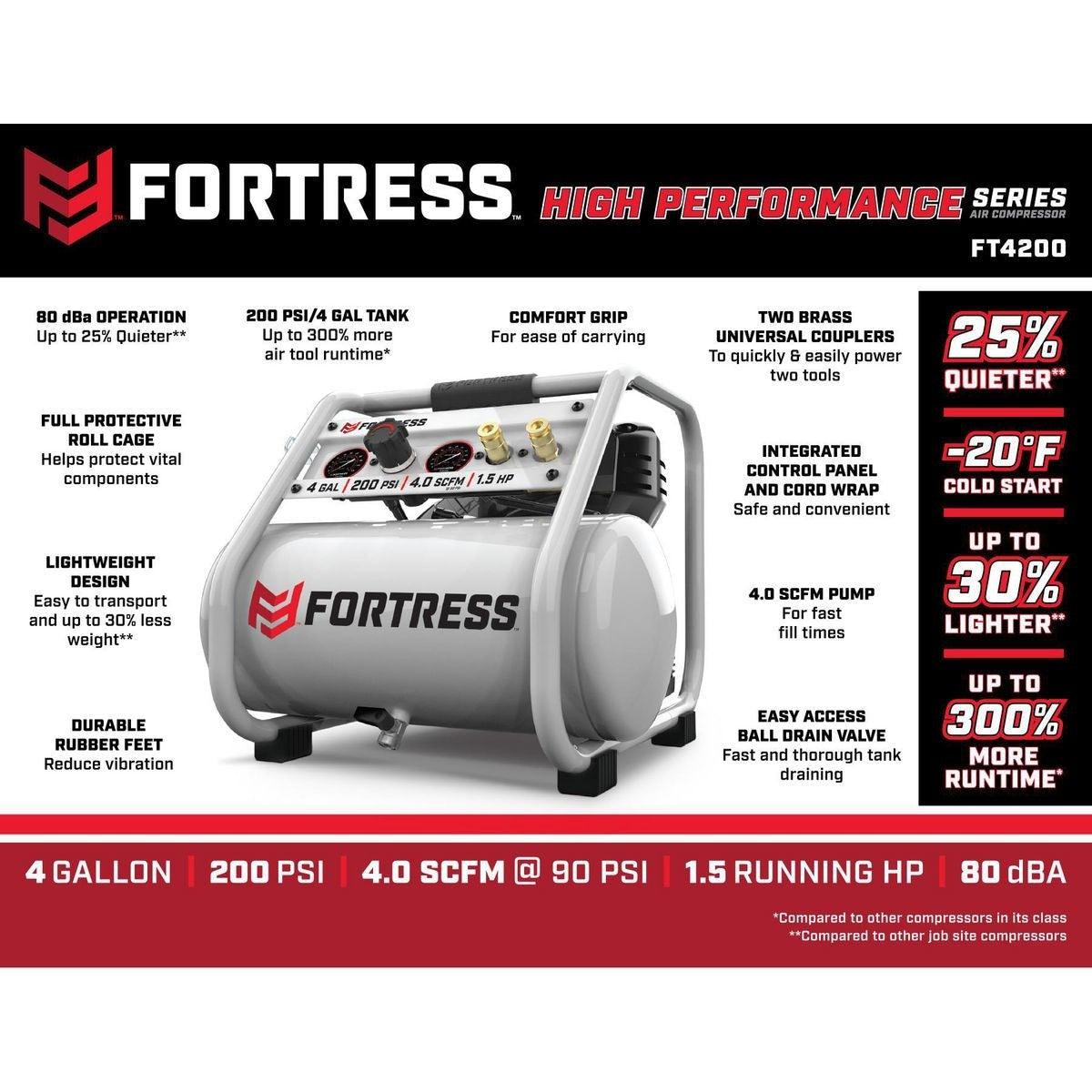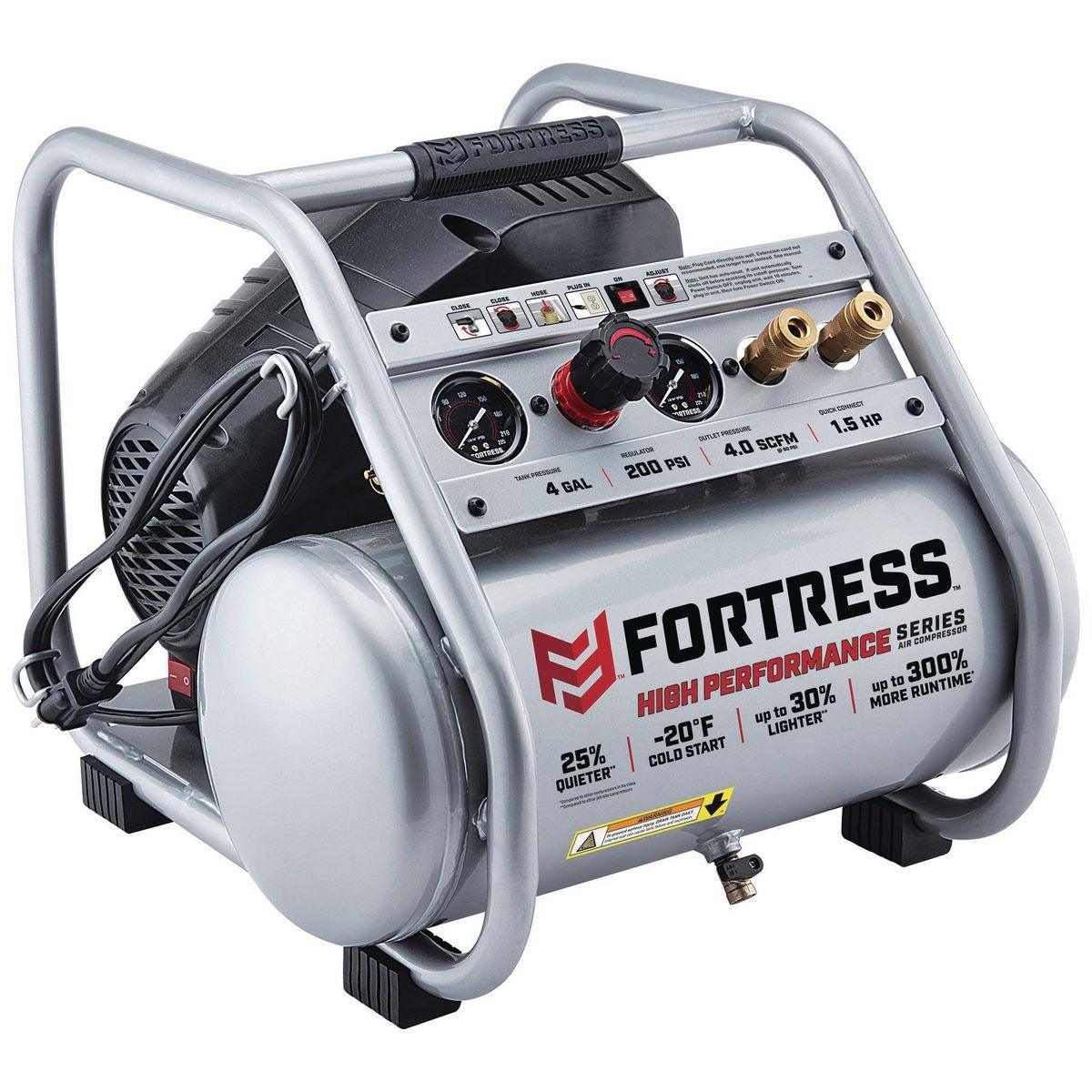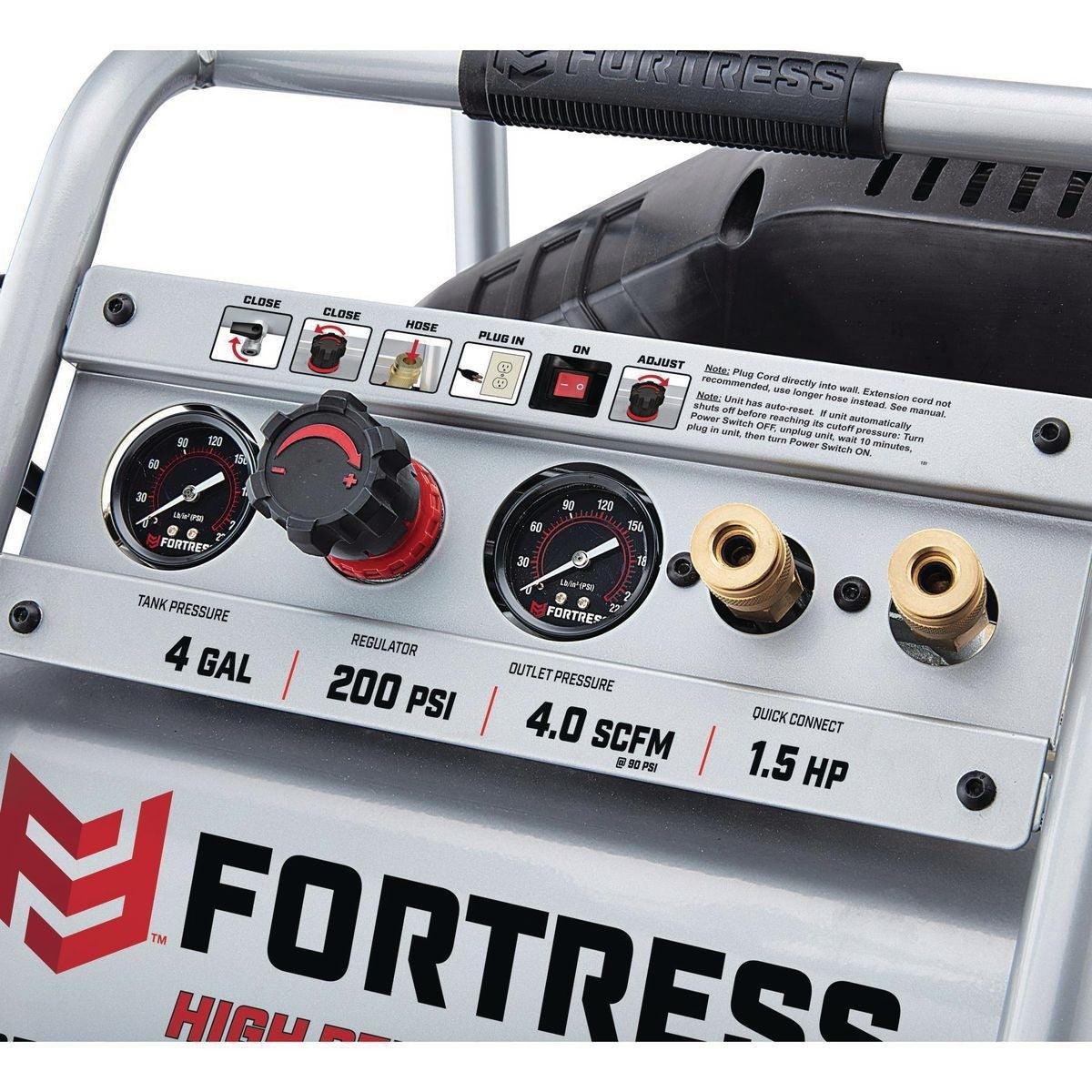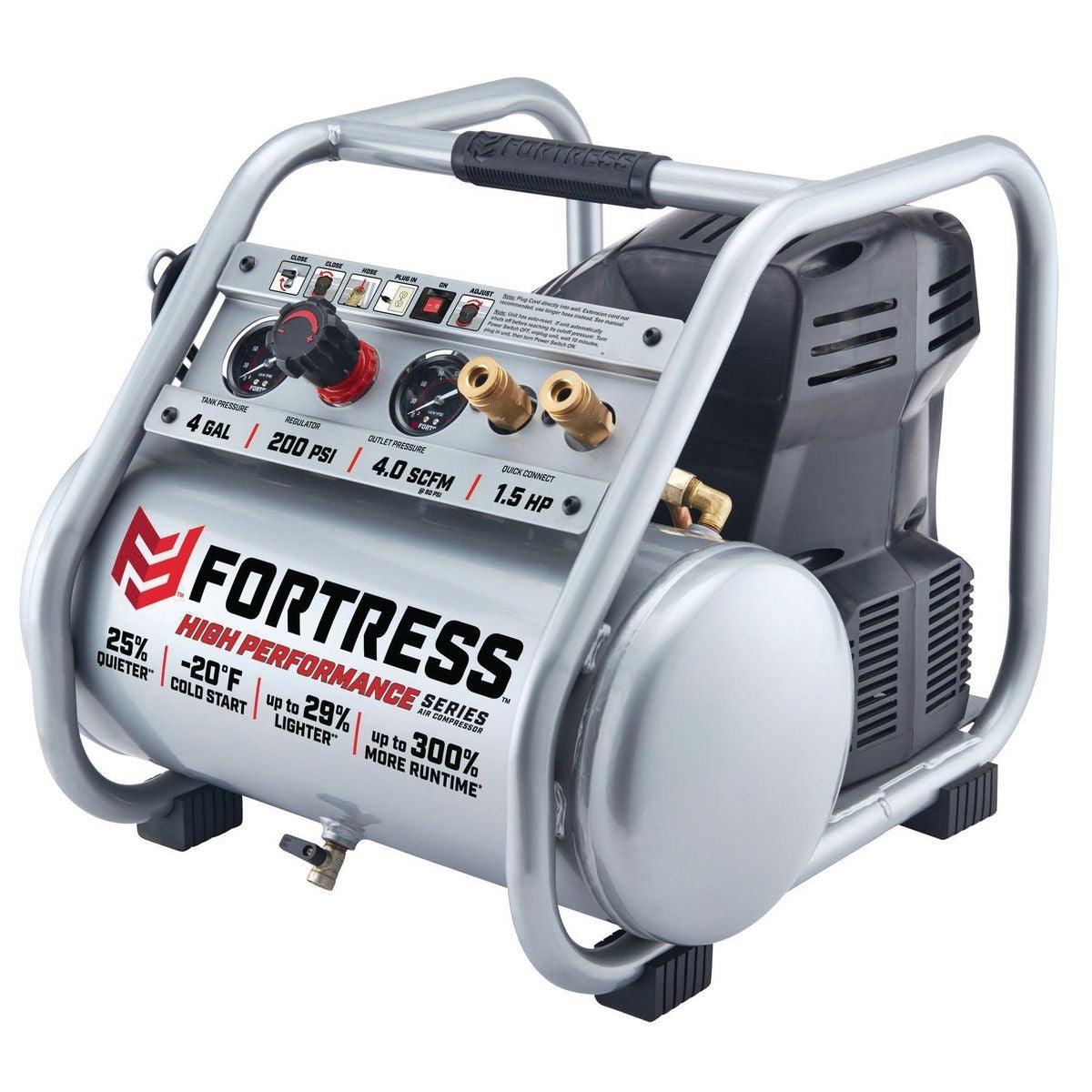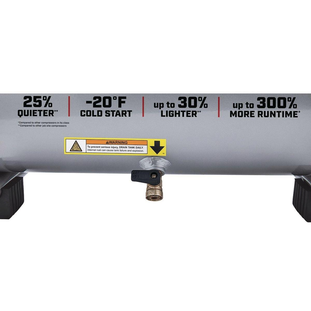 This Fortress™ Air Compressor is up to 30% lighter than other compressors in its class. Don't let the small size fool you - this professional quality air compressor delivers up to 300% more runtime than similar jobsite compressors. Featuring an integrated control panel with easy-to-read gauges and two built-in quick connect couplers for running multiple tools.