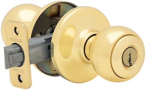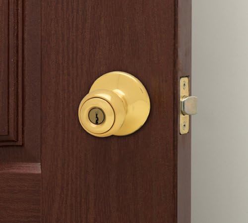 The Kwikset Polo entry lockset delivers classic round-knob styling in a durable polished brass finish. ANSI/BHMA Grade 3 certified, it features an adjustable latch to fit standard exterior doors and smooth key/turn-button operation for everyday security.