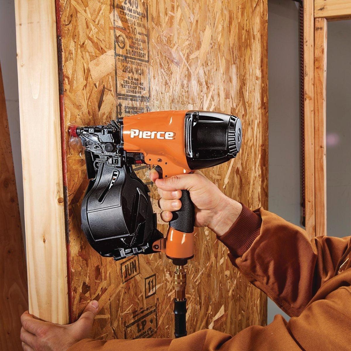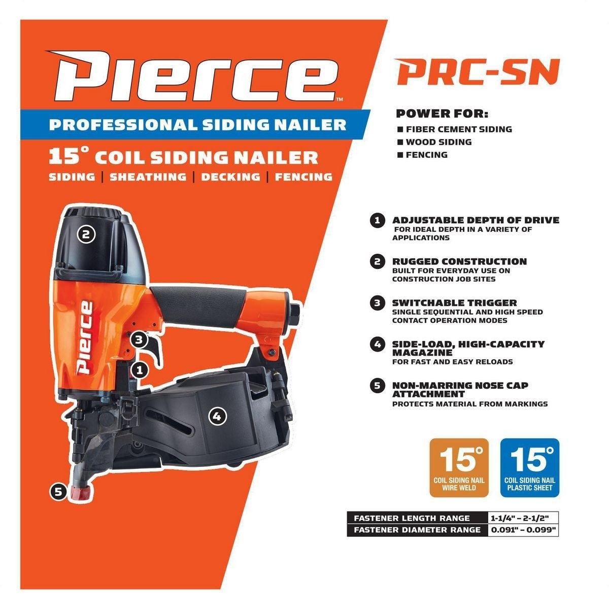 The Pierce™ 15° Professional Coil Siding Nailer is engineered for heavy use on construction jobsites. The superior drive power sinks 2-1/2 in. nails into wood and the tool-less depth of drive adjustment allows for exact nail depth control. Designed with switchable trigger, single sequential and high speed contact operation. Equipped with a high capacity, side load canister for fast and easy reloads.