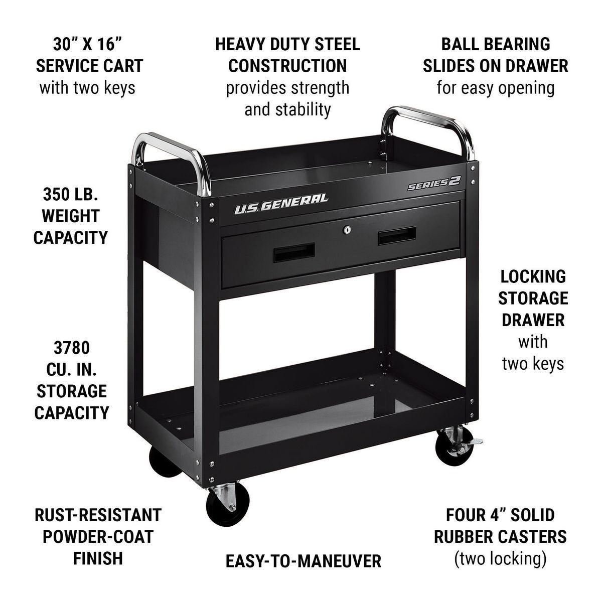 This sturdy, all steel, tool cart has a large drawer and generous top compartment, making it a versatile mobile workstation. With over 3780 cu. in. storage capacity this mobile tool cart keeps the tools and supplies you need close at hand while you work.
