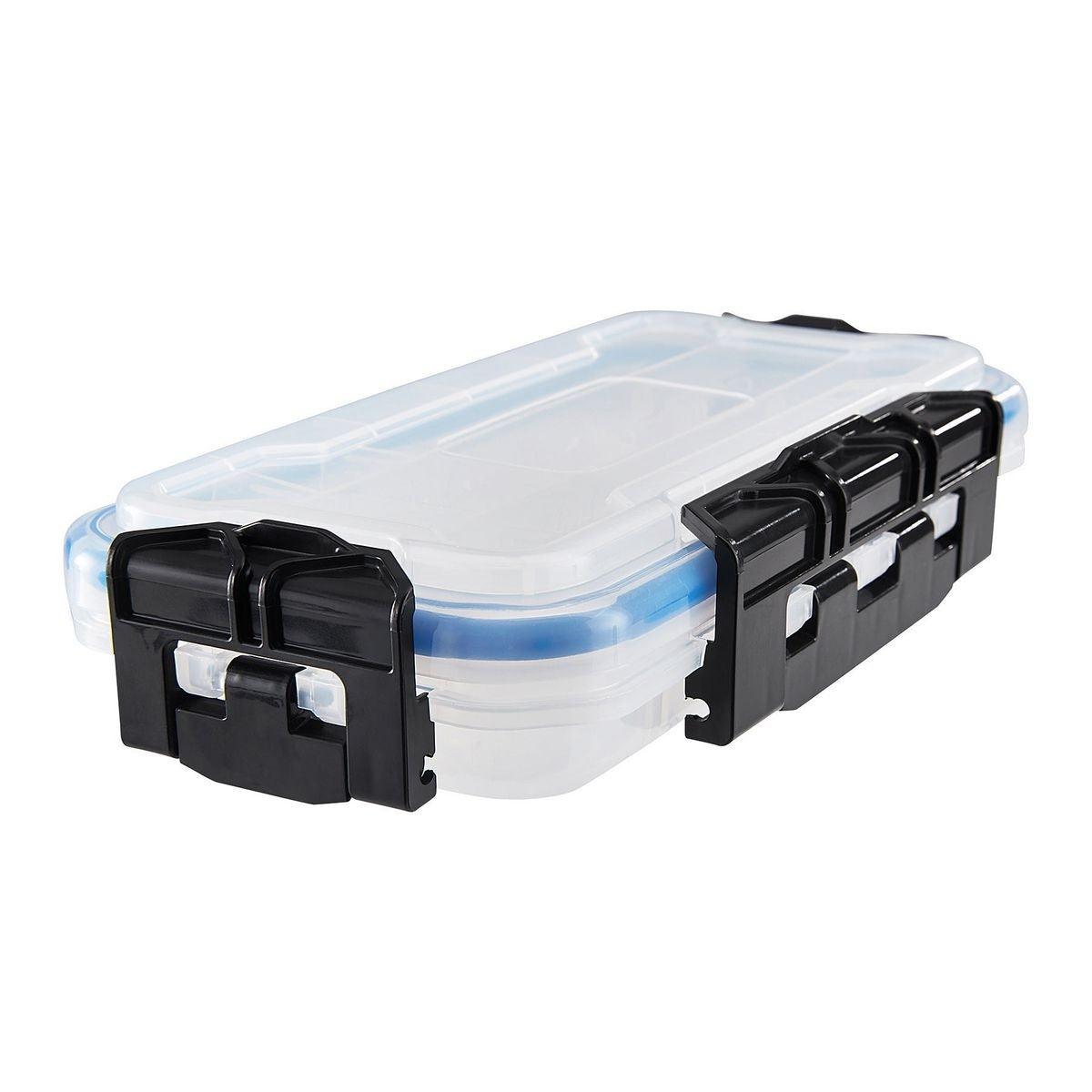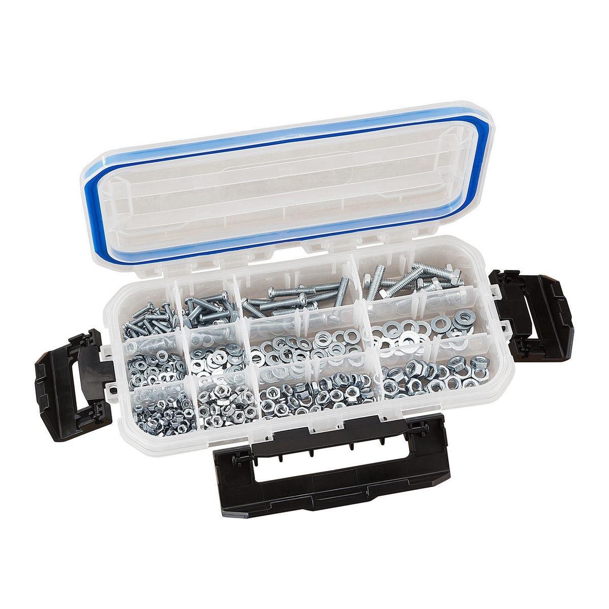 This clear small organizer has up to 18 individual compartments for storing small parts or supplies. Three strong easy-open latches keep the lid sealed tight to keep out dirt, dust and debris. This small organizer is transparent so the contents can be easily viewed. Ideal for fasteners, fishing tackle, craft supplies, and more!