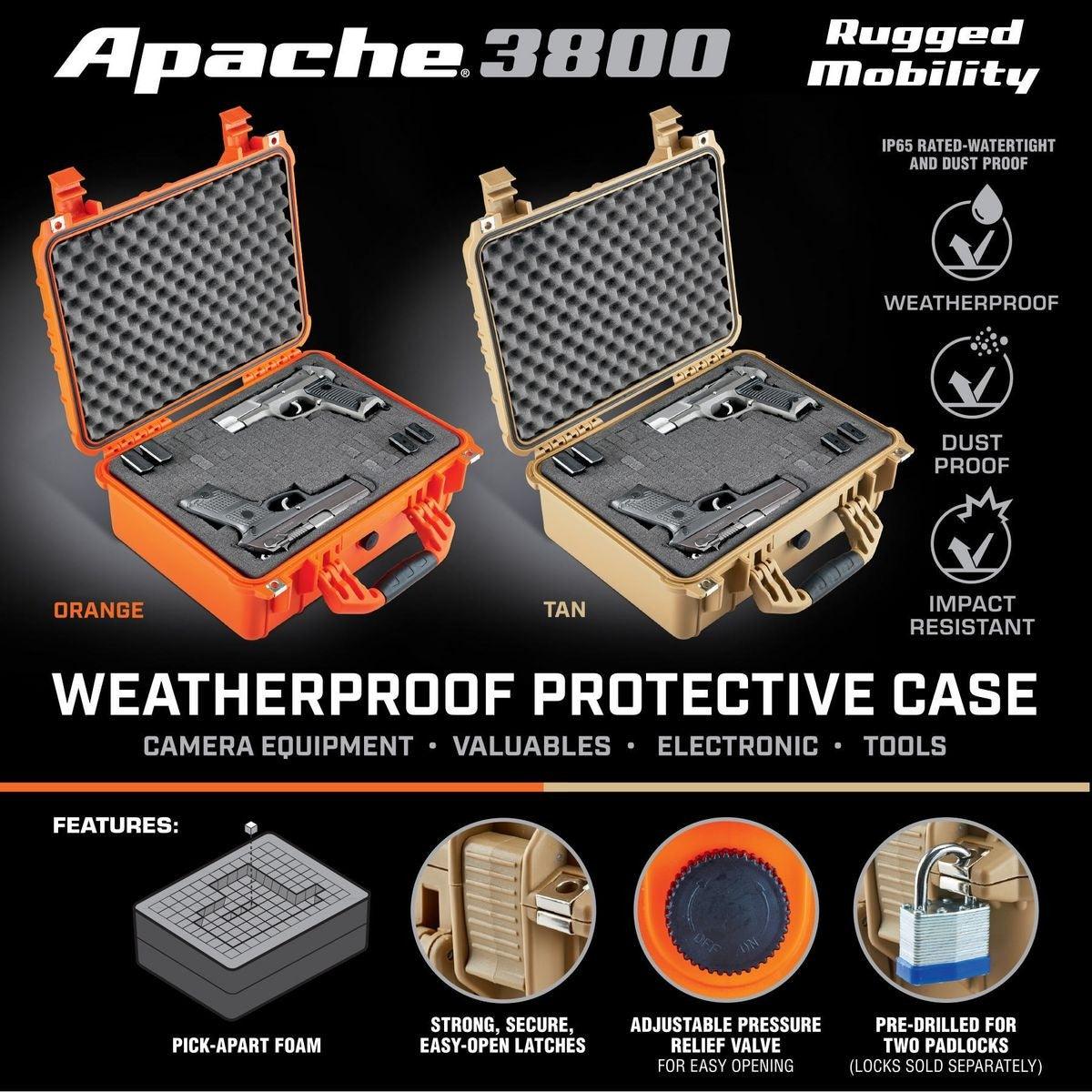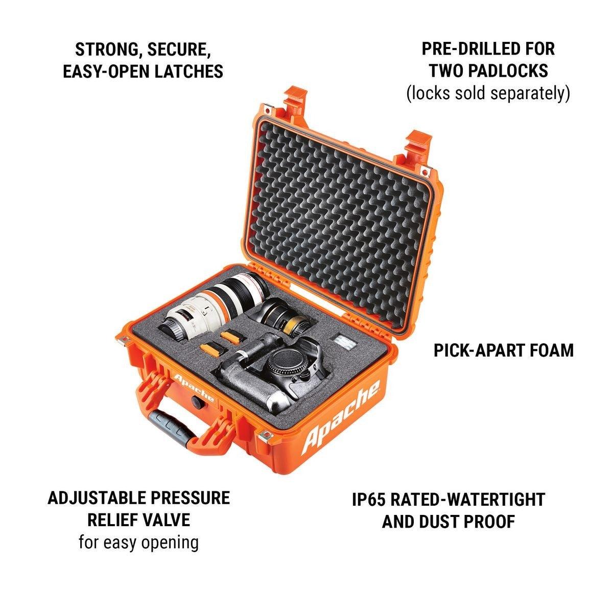 Protect cameras, microphones, handguns and other specialized equipment with this exceptionally rugged Apache® weatherproof storage case. Constructed from extremely durable polypropylene, this professional quality hard case takes a beating while protecting the contents from impact, moisture and microscopic dust. The built-in purge valve equalizes pressure so you can open the case after changing elevations.
