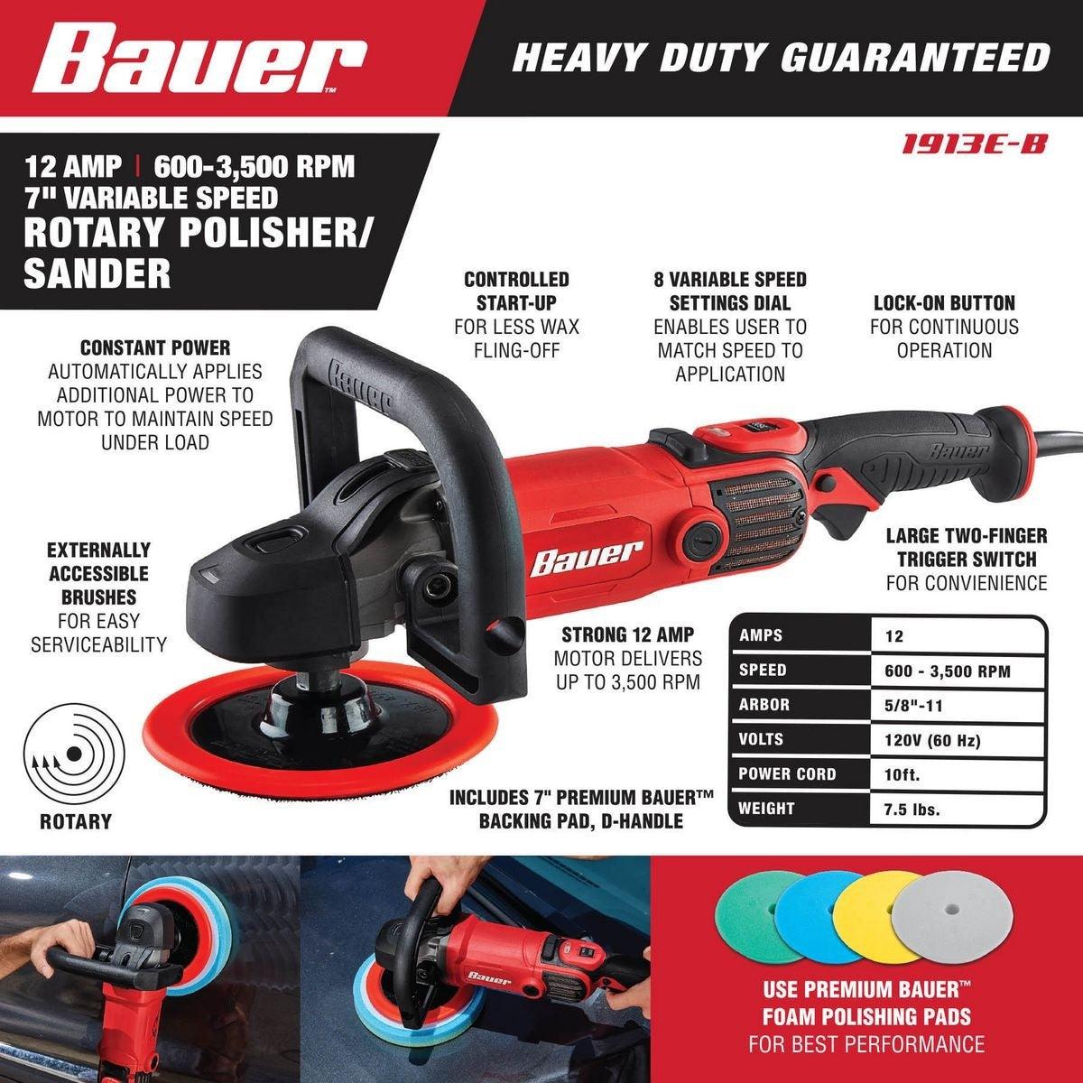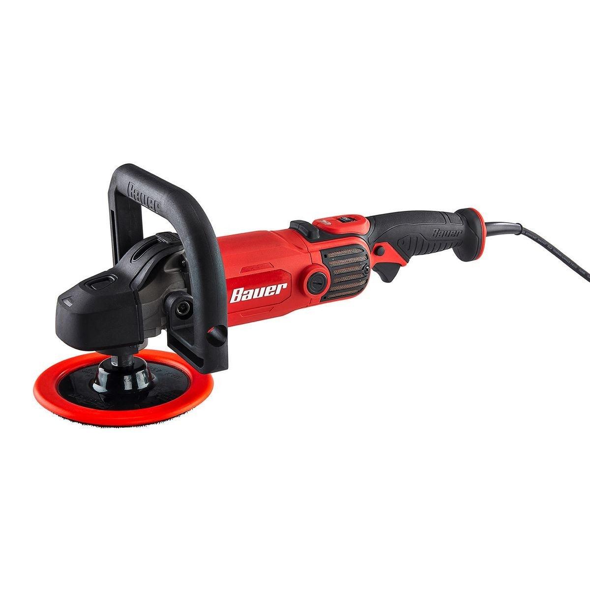 The Bauer™ 7 in. 12 Amp Variable Speed Rotary Polisher/Sander delivers 600 - 3500 RPM for smooth finishes. Eight variable speed settings adjust output precisely to match the type of work. The adjustable D-handle provides comfort and control in any position.