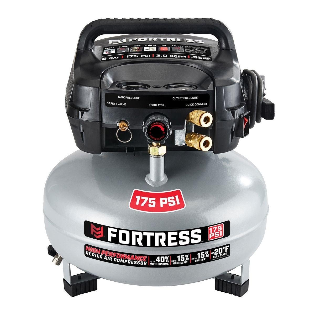 This Fortress™ Air Compressor delivers up to 40% more runtime and is 15% lighter than other compressors in its class. Don't let the small size fool you - this professional quality air compressor delivers up to 15% more SCFM. Featuring an integrated control panel with easy-to-read gauges and two built-in quick connect couplers for running multiple tools.