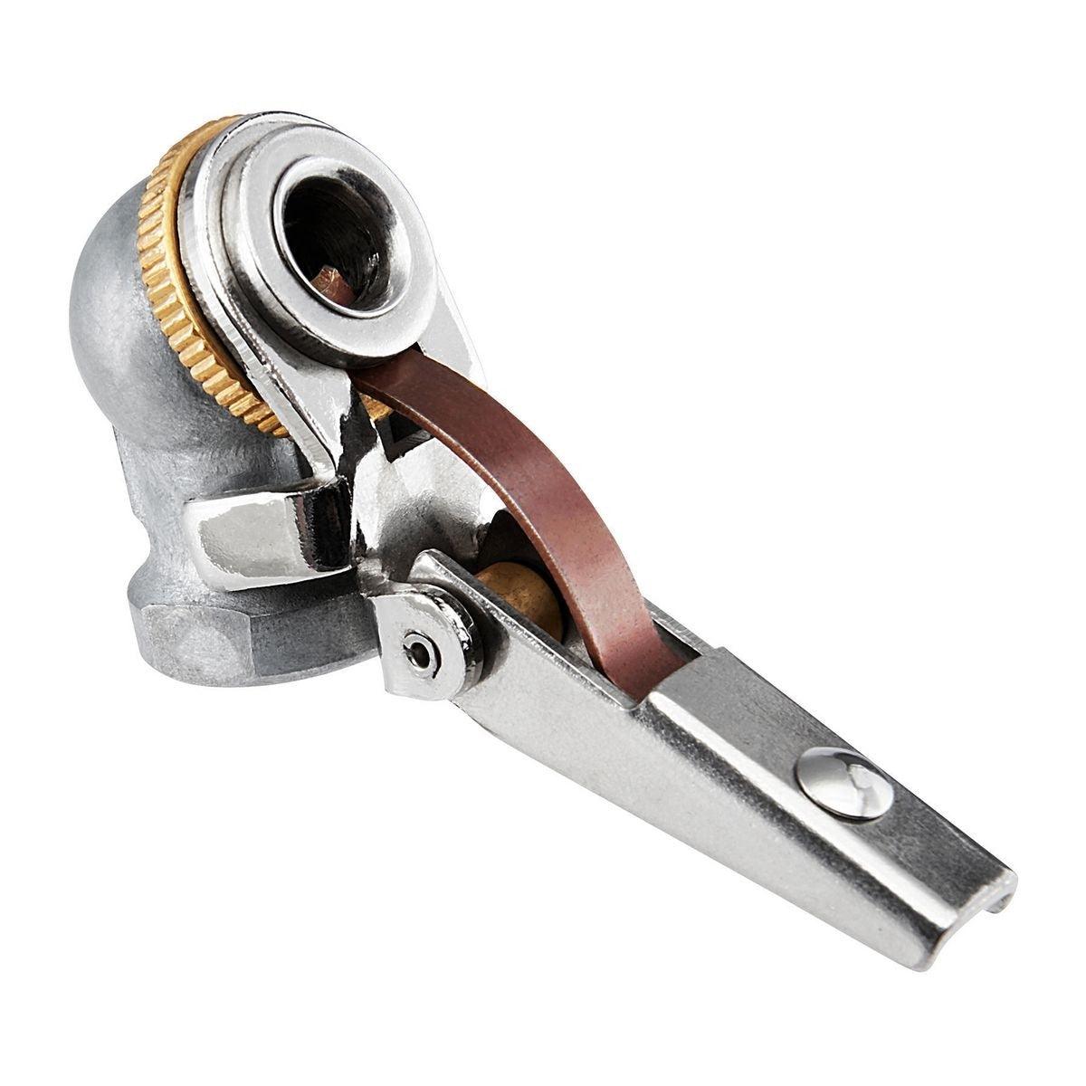 This premium ball foot tire chuck has a right-angle head for easy access to most valve stems - even on spoked wheels. The spring-action lock keeps the chuck in place during inflation. The high quality nickel and chrome finish provide additional durability, up to 4X life compared to similar chucks.