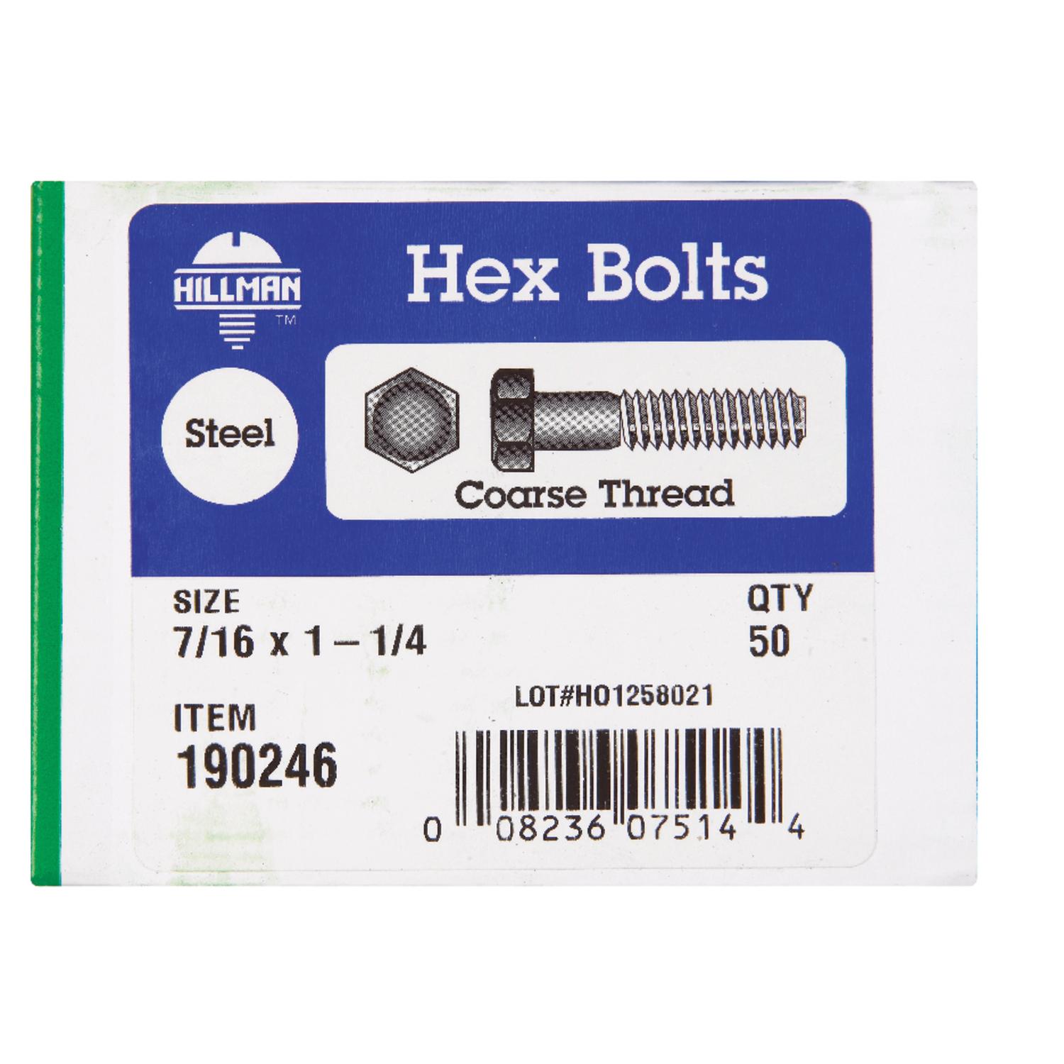 Hillman 7/16 in. Diameter x 1-1/4 in. Length Zinc-Plated Steel Hex Bolt, Coarse Thread, 50-Pack