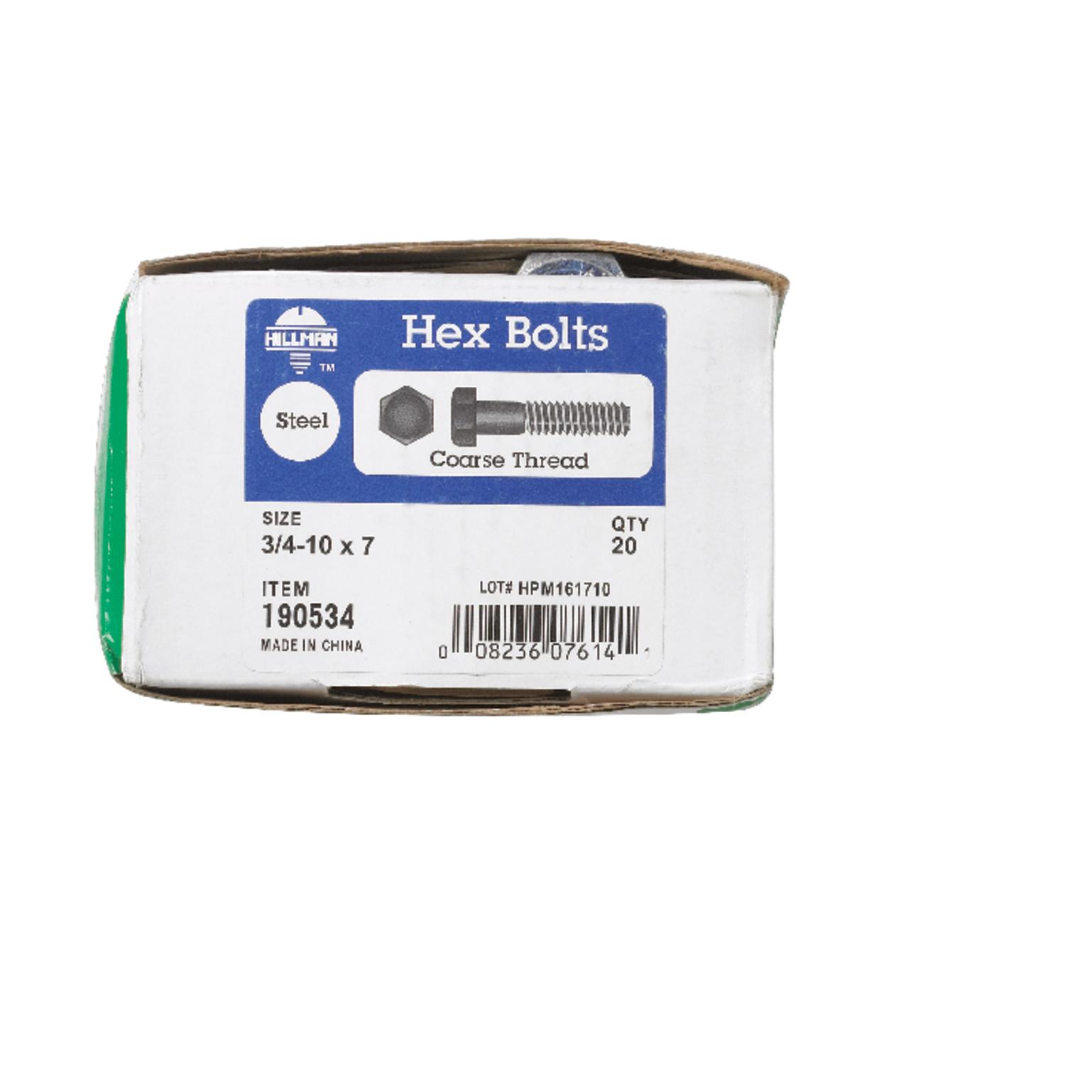 Hillman 3/4 in. Diameter x 7 in. Length Zinc-Plated Steel Hex Bolt, Coarse Thread, 20-Pack