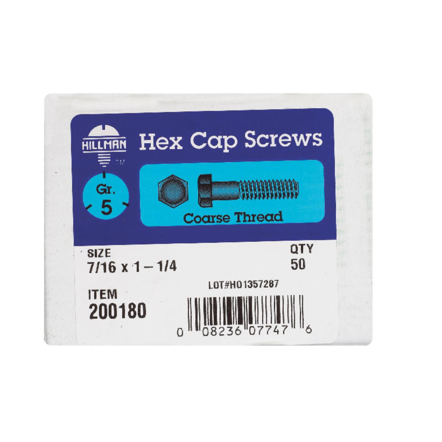 Hillman 7/16 in. Dia x 1-1/4 in. L Grade 5 Heat-Treated Zinc Steel Hex Head Cap Screws, Coarse Thread, 50-Pack