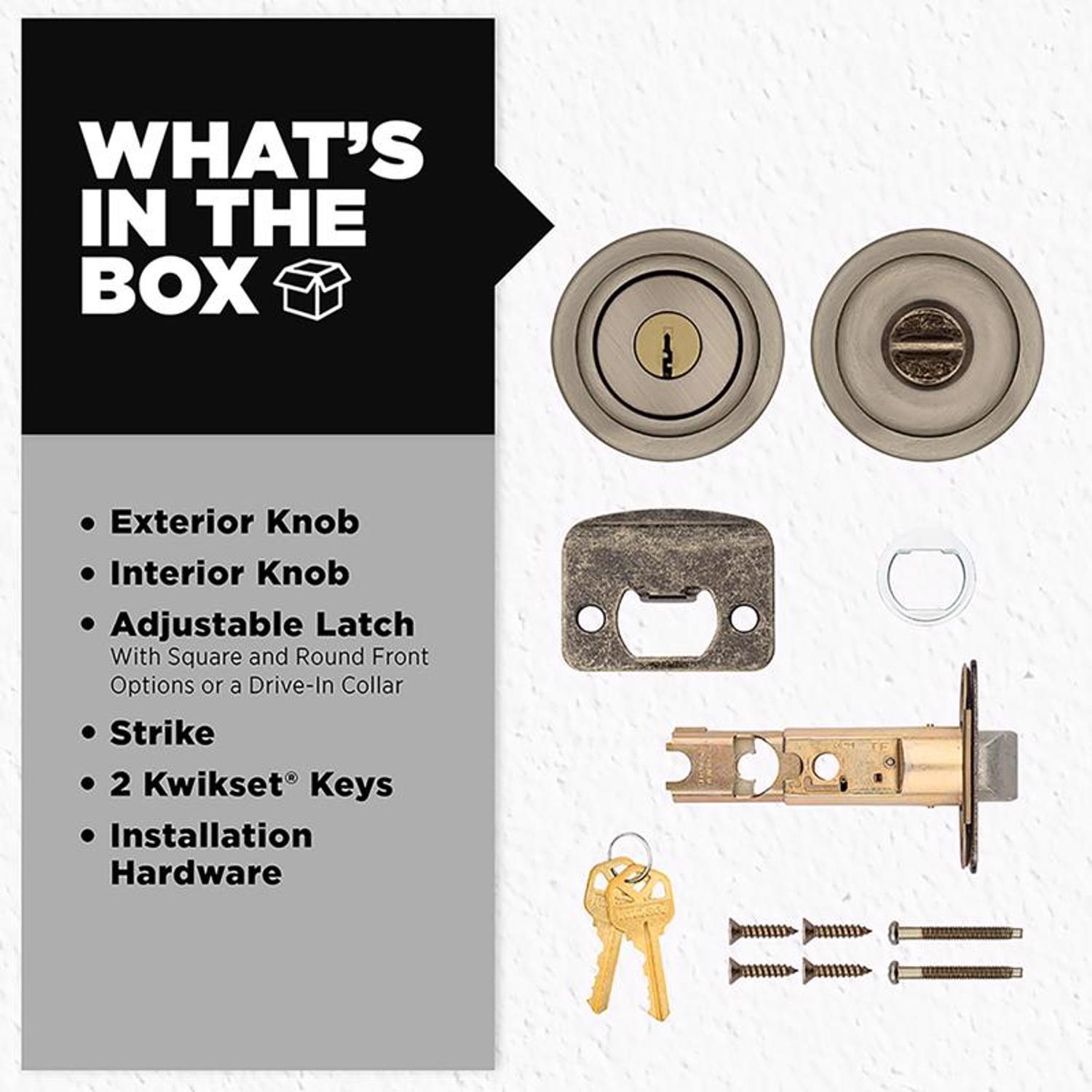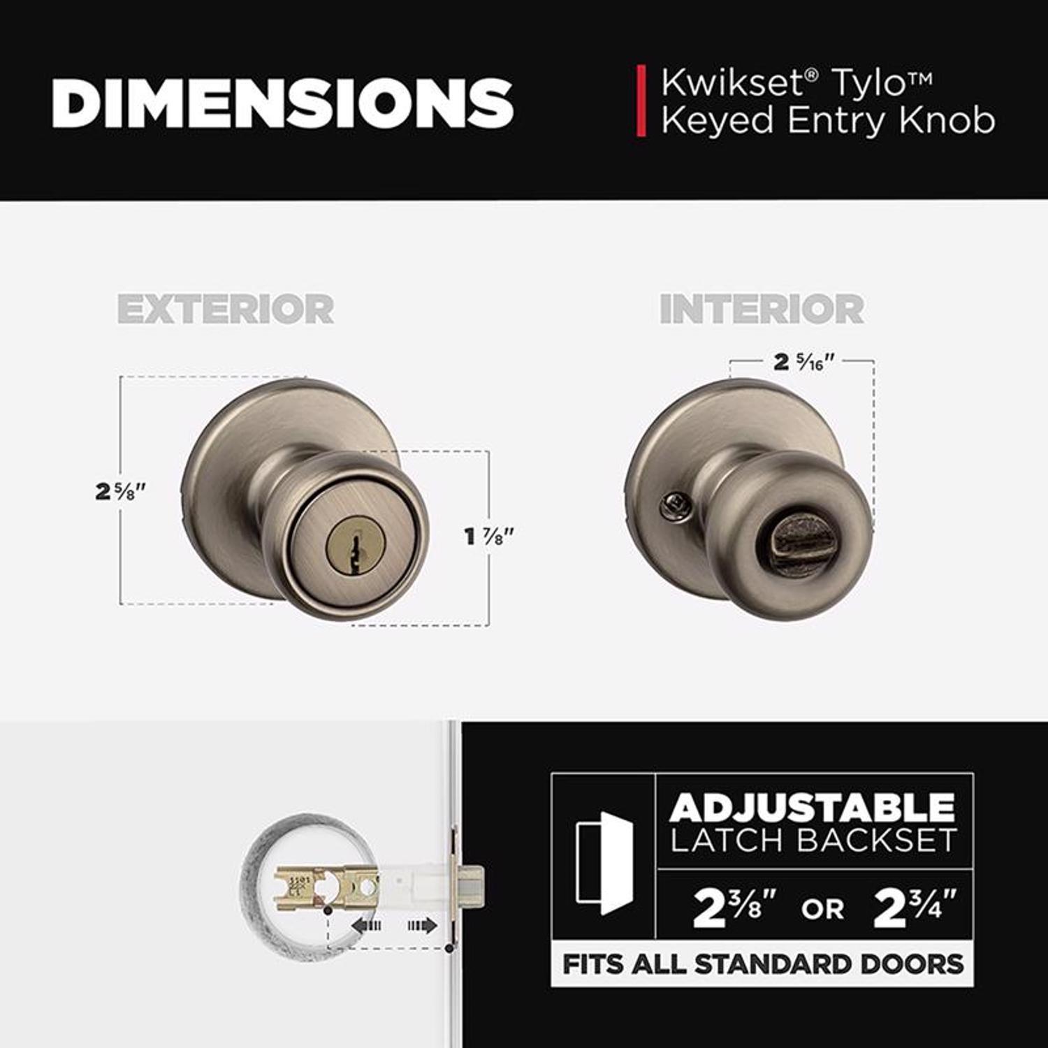 The Kwikset Tylo keyed entry knob delivers dependable security in a classic round design with a warm Antique Brass finish. It features adjustable latch backset to fit standard doors and universal handing for right- or left-handed installation. Built for residential exterior doors, it installs quickly with just a screwdriver.