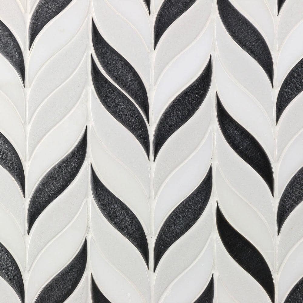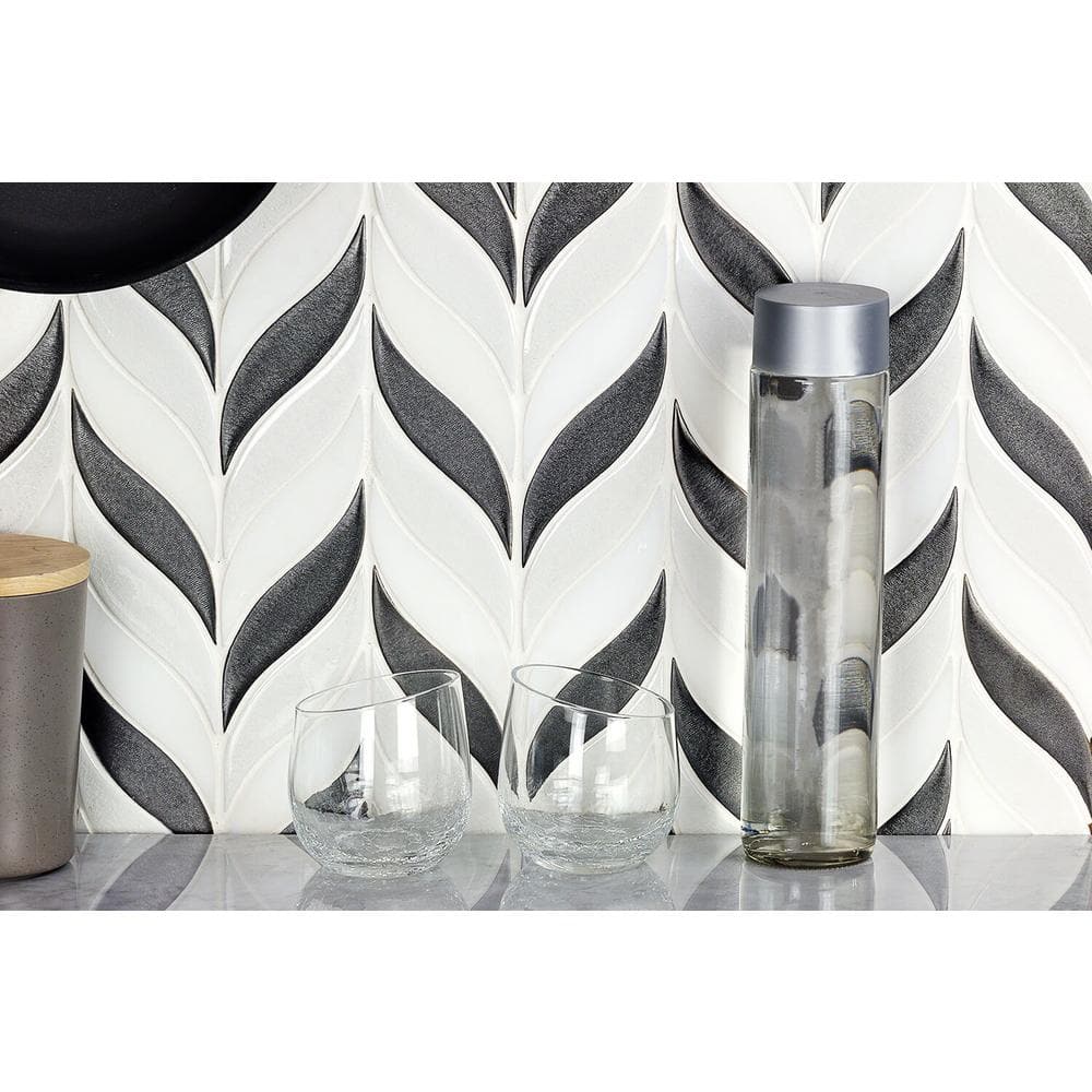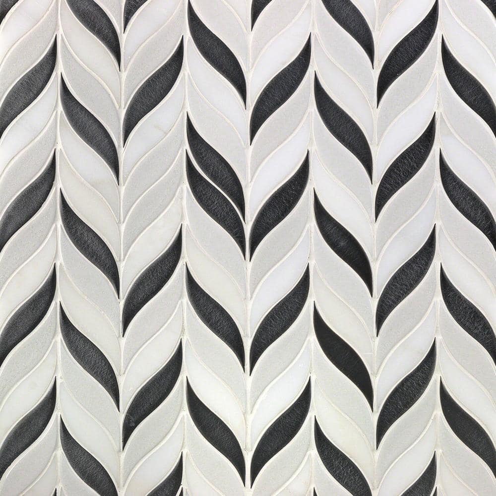 This mosaic unfolds like a rhythmic couture leaf, its gunmetal and alabaster tones creating a chic, textural backdrop. The glossy glaze catches light beautifully, lending a luminous cadence to any kitchen or bath. Style it with brushed nickel hardware and soft gray cabinetry to let the pattern sing without overpowering the room. A modern classic, it’s an essential touch for effortlessly luxurious living.