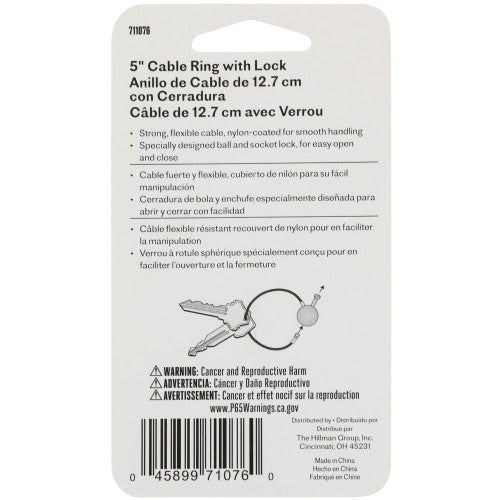 Durable 5-inch cable key ring designed for easy, secure key management. Nylon-coated steel cable with a ball-and-socket lock opens and closes smoothly while retaining its shape through repeated use.